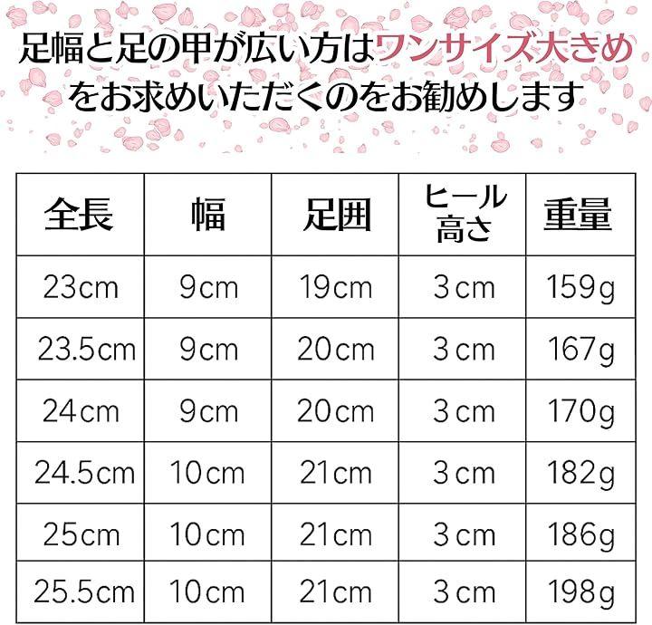 サイズ (23) 全長:23cm 幅:9cm 足囲:19cm ヒールの高さ:3cm 重量: 159g (23.5) 全長:23.5cm 幅:9cm 足囲:20cm ヒールの高さ:3cm 重量:167g (24) 全長:24cm 幅:9cm 足囲:20cm ヒールの高さ:3cm 重量:170g (24.5) 全長:24.5cm 幅:10cm 足囲:21cm ヒールの高さ:3cm 重量:182g (25) 全長:25cm 幅:10cm 足囲:21cmヒールの高さ::3cm 重量:186g (25.5) 全長:25.5cm 幅:10cm 足囲:21cm ヒールの高さ::3cm 重量:198g 寸法は平置きでの採寸となり寸法・重量には若干の個体差があります。