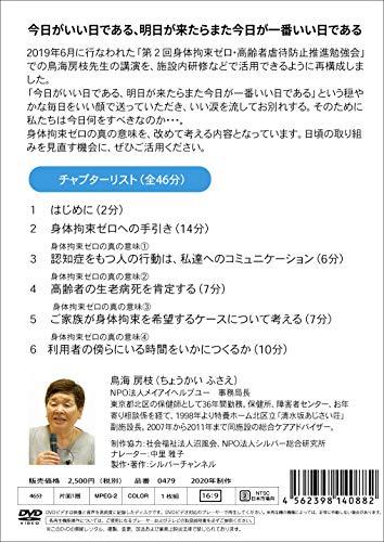 今日がいい日である、明日が来たらまた今日が一番いい日である身体拘束禁止から20年。身体拘束ゼロ作戦推進会議のメンバーだった鳥海先生が話す「身体拘束ゼロの真の意味」をまとめたDVDです。2019年6月に行なわれた「第2回身体拘束ゼロ・高齢者虐待防止推進勉強会」での鳥海先生の講演を、施設内研修などで活用できるように再構成しました。「今日がいい日である、明日が来たらまた今日が一番いい日である」という毎日をいい顔で送っていただき、いい涙を流してお別れする。そのために、私たちは今日何をすべきなのか・・・。身体拘束ゼロの真の意味を、改めて考える内容となっています。日頃の取り組みを見直す機会に、ぜひご活用ください。DVDの収録内容(46分)1.はじめに 2分2.身体拘束ゼロへの手引き 14分3.身体拘束ゼロの真の意味1?認知症をもつ人の行動は、私達へのコミュニケーション 6分4.身体拘束ゼロの真の意味2 ?高齢者の生老病死を肯定する 7分5.身体拘束ゼロの真の意味3 ?ご家族が身体拘束を希望するケースについて考える 7分6.身体拘束ゼロの真の意味4 ?利用者の傍らにいる時間をいかにつくるか 10分鳥海 房枝(ちょうかい ふさえ)NPO法人メイアイヘルプユー事務局長東京都北区の保健師として36年間勤務。保健所、障害者センター、お年寄り相談係を経て、1998年より北区立特別養護老人ホーム清水坂あじさい荘副施設長。2007年から2011年まで同施設の総合ケアアドバイザー。制作協力:社会福祉法人沼風会、NPO法人シルバー総合研究所ナレーター:中里 雅子製作・著作:シルバーチャンネル