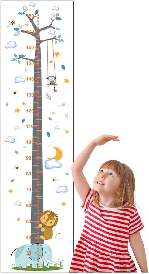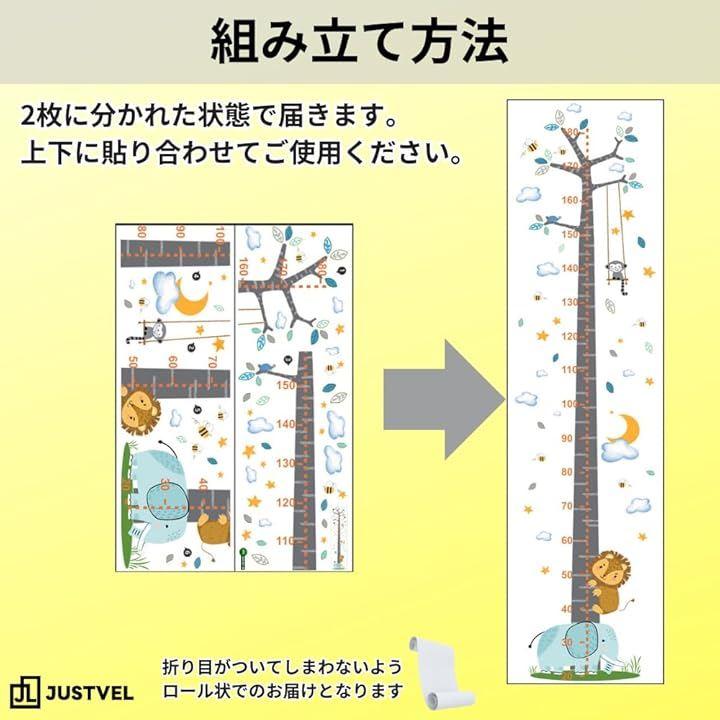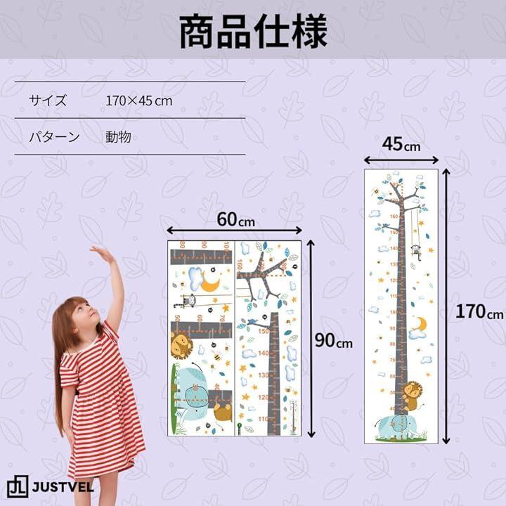 「子供の成長を楽しく記録できる身長計ウォールステッカー」ぞうとライオンのかわいい動物イラストが特徴的な壁掛け身長計です。