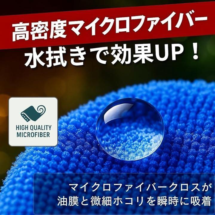 「マイクロファイバークロス」付属の高密度マイクロファイバークロスが油膜と微細ホコリを瞬時に吸着。