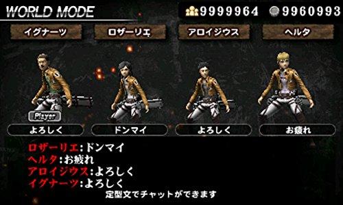 オンラインマルチプレイ解禁これまでローカル通信でしか遊べなかった協力プレイが、インターネット回線を使って離れた仲間と最大4人で協力プレイすることが可能にサバイバルモードで討伐数を競い合え原作の残酷なまでの世界観をより身近に感じたいユーザー向けに、難易度の高いサバイバルモードが追加。インターネット回線を使って討伐数に応じたランキングが閲覧できるぞ。ゲームボリュームが大幅アップステージやミッション、キャラクター、巨人、装備、コスチュームなどが新たに追加。ゲームのボリュームが大幅に増えただけではなく、既存のミッションについても立体機動の動きや巨人の挙動、難易度などが細かく調整された。キャラクターボイスの追加新たに20名以上のキャラクターボイスを収録。もちろん前作に登場したキャラクターも追加でボイスを収録しています。【新規ボイス追加キャラクター】・オルオ・ボザド:川田紳司・ペトラ・ラル:相川奈都姫・イルゼ・ラングナー:國立幸・ハンネス:藤原啓治・マルコ・ボット:逢坂良太・ドット・ピクシス:田中正彦・エルド・ジン:千葉進歩・リコ・ブレツェンスカ:鷄冠井美智子・ヒッチ:渡辺明乃・マルロ・フロイデンベルク:杉田智和・ユミル:藤田咲・ベルトルト・フーバー:橋詰知久 他多数!!型番 : CTR-P-BG2J オンライン協力プレイ解禁! ニンテンドー3DSで進撃の巨人を体感せよ 前作ニンテンドー3DS『進撃の巨人~人類最後の翼~』が、待望のインターネット協力プレイなどの新要素を追加し、大幅にバージョンアップ