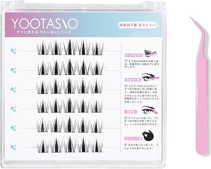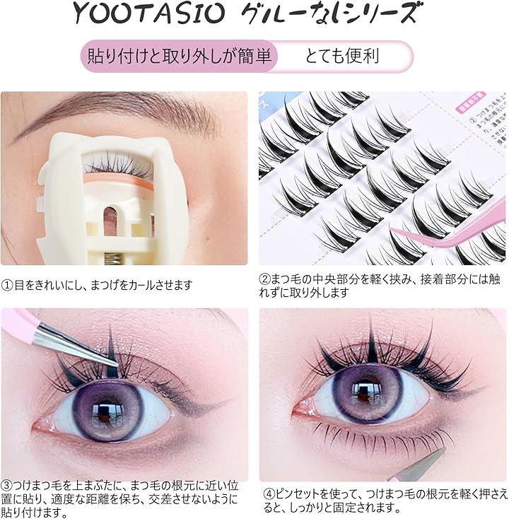 YOOTASIO すぐに使える グルーなしシリーズ 接着剤不要 落ちにくい --- 使用方法: (1) まつ毛の中央部分を軽く挟み、接着部分には触れずに取り外します。