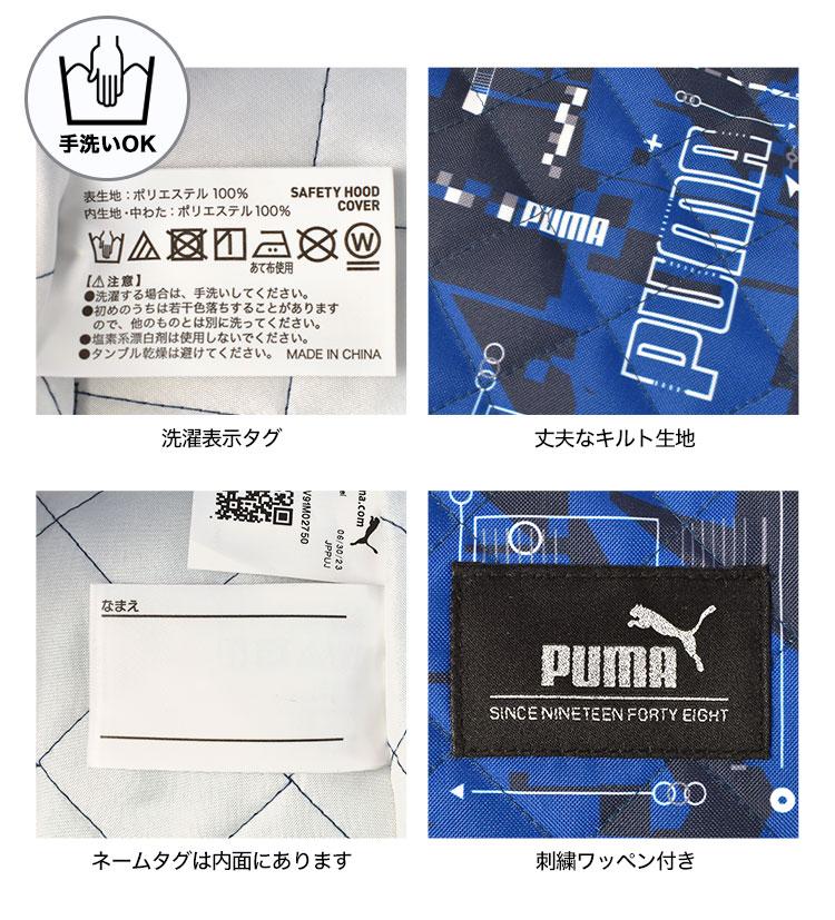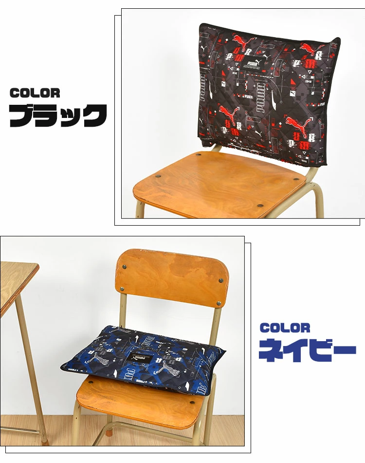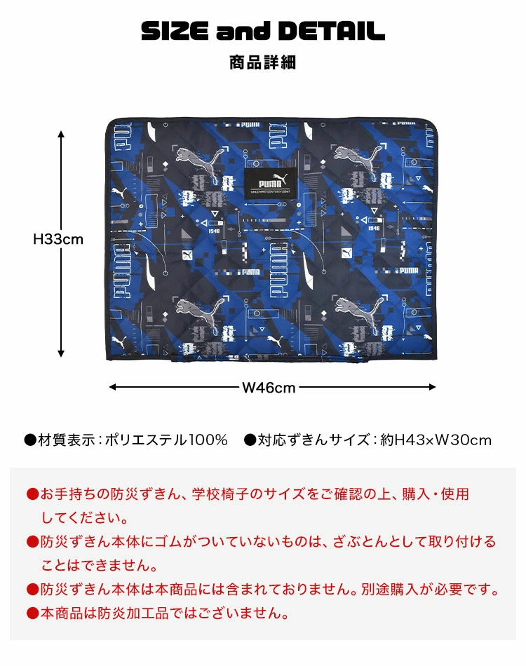 【防災ずきんカバー】別売りの防災ずきんとお揃いのPUMA柄カバー。平常時にずきんを背もたれやざぶとんとして使用する際、より快適に使っていただけます。取り出し口が大きいので、ずきんを実際に使う緊急時ももたつかず安心です。お揃い柄でぴったりサイズの防災ずきんも別売しております!