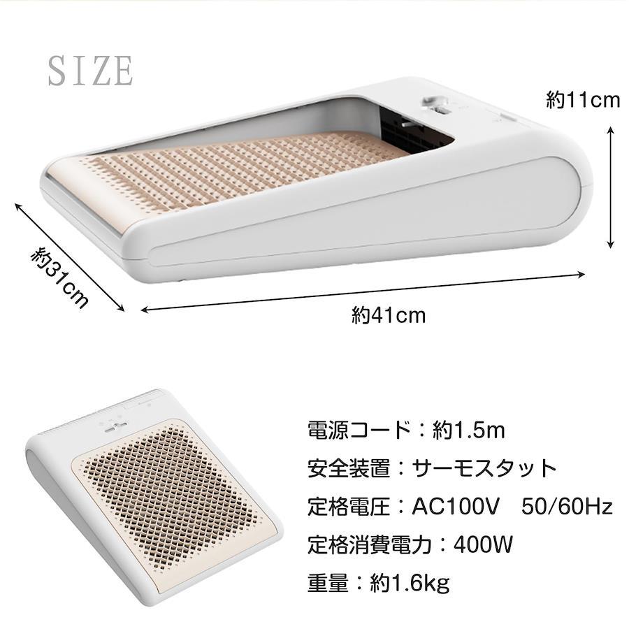 【商品内容】:フットウォーマー sg139型【サイズ】:(約)×31×41×11cm【重量】:(約)1.6kg【電源コード長さ】:(約)1.5m【安全装置】:サーモスタット【定格電圧】:AC100V 50/60Hz【定格消費電力】:400W