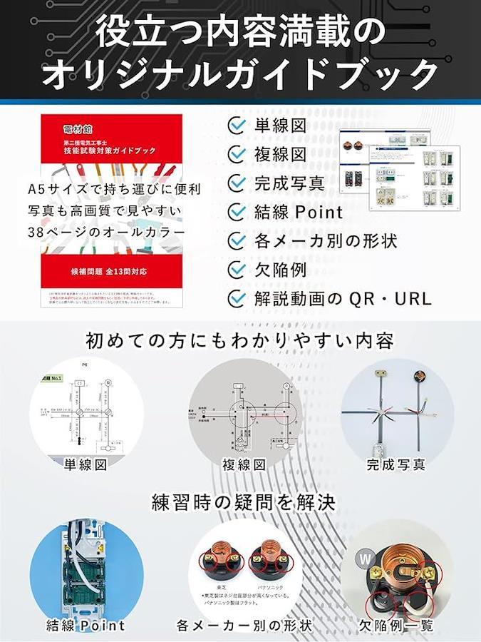 「特徴2」付属のガイドブックには、単線図、複線図をはじめ、完成写真や結線ポイント、欠損事例など、試験に役立つ情報が満載。
