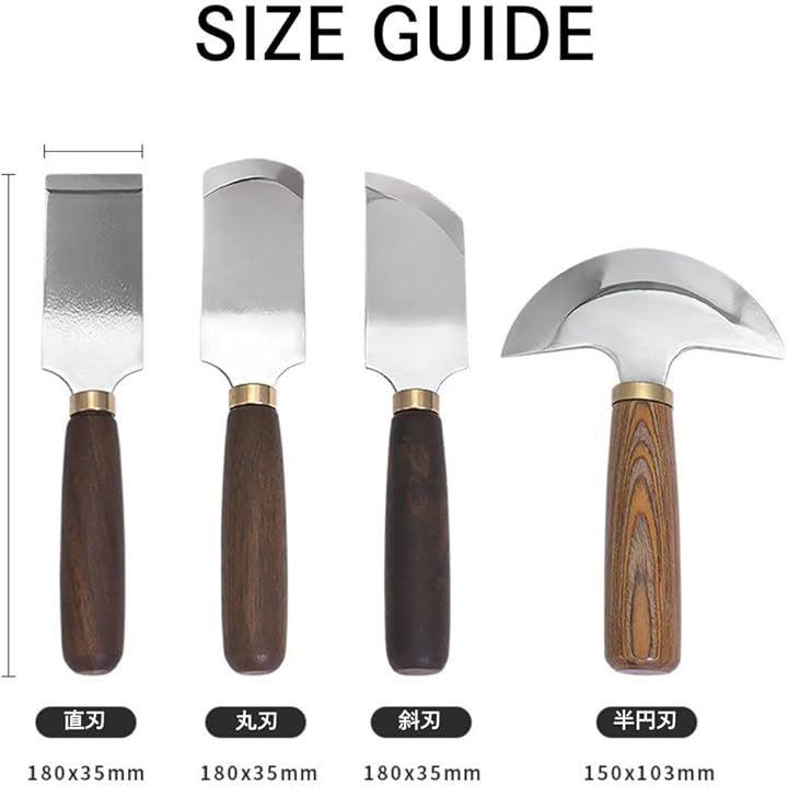 「概要」レザークラフトで革を削いだり、切ったり、革を漉くなどに利用する丸包丁、平包丁、斜包丁です。
