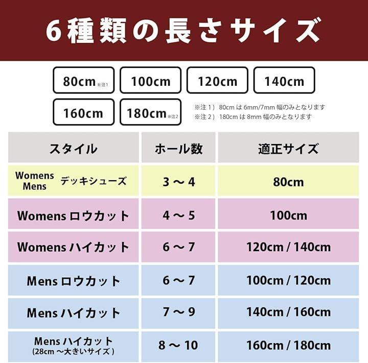 「スニーカーに合わせて選べるサイズ」 長さは80cm~180cmまで6種類(*180cmは8mm幅のみ)、幅は6mm / 7mm / 8mmの3タイプをご用意。