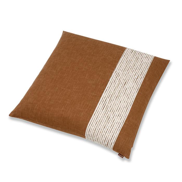 南蛮貿易で日本に入って来た縞模様は、江戸時代に庶民の間で持て囃されました。江戸っ子が様々な縞模様を創りだし「粋」を楽しんだそうで、ごく細い縞模様を【千筋(せんすじ)】とよびます。自然な白地に筆で引いたような焦茶と細い金の縞が入る生地と、一見無地にも見える繊細なシケ模様が入った無地おぼろ染めとの組み合わせは、シンプルモダンで和洋問わずどんな空間にも合うデザインです。無地おぼろ染め部分は【黒ねず】と【栗梅】をご用意しました。生地はざっくりとした織目で、手になじみの良い変わり織りです。【カバーサイズ】 横55㎝×縦55㎝【生地素材】 綿(変わり織り)100%この商品はカバー(ファスナー加工)のみです。中わたは別途ご購入ください。またカートの購入可能数より多い数をご希望の場合はご相談ください。