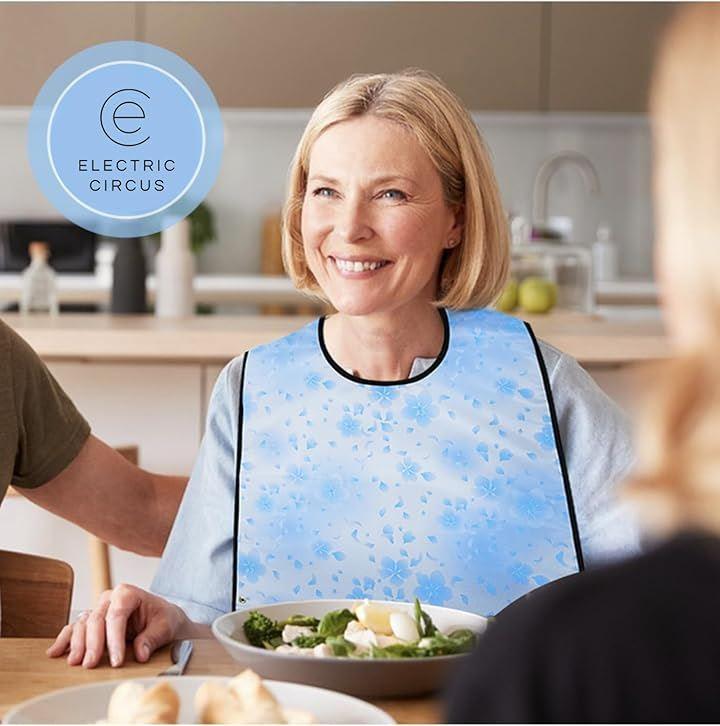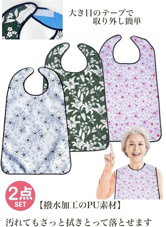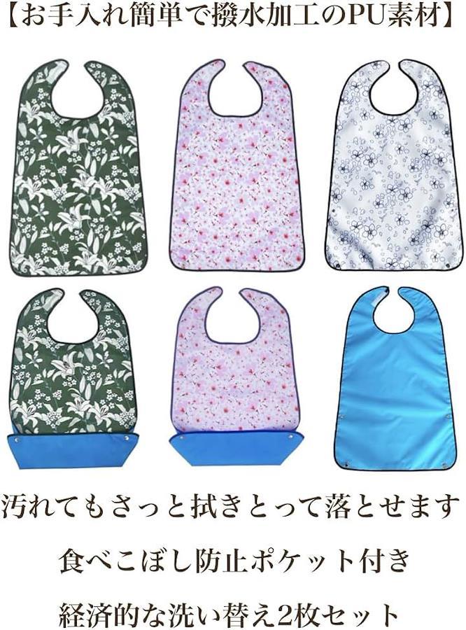 「しっかり防水・お手入れ簡単で撥水加工のPU素材」汚れてもさっと拭きとって落とせます・食べこぼし防止ポケット付き・大き目のテープで着脱簡単・経済的な洗い替え2枚セット