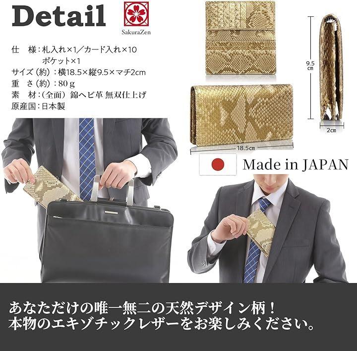 「 整理と出しやすさを追求した被せ型 長財布 」仕様:札入x1(札束が入る通しマチタイプ)・カード入x10・ポケットx1(札束入れですので小銭入れはありません)、SIZE::約18.5x9.5x2cm 、素材:錦蛇皮革(全面蛇革 無双仕上)原産国:日本製 「ご注意」天然蛇革皮革(エキゾチックレザー)の為、一つ一つの鱗(ウロコ)模様などが画像とは異なります。