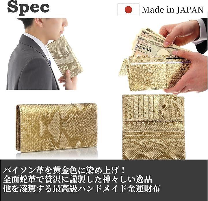 「金運財布の特徴」こちらの金運財布は、錦蛇の上質皮革を黄金色に染め上げています。