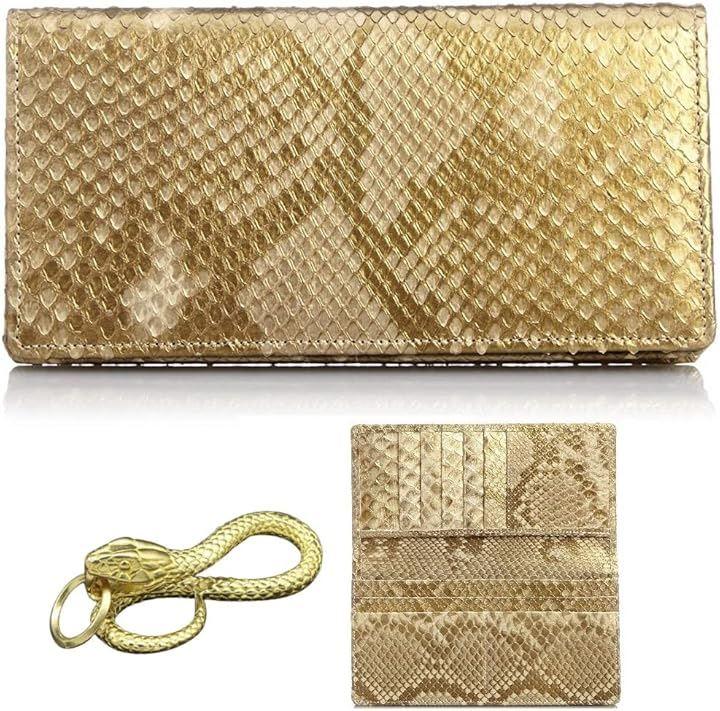 「 縁起の良い金運財布 」古来より蛇は脱皮を繰り返し大きくなる事から無限に通ずる金運アップに良いとされ、錦蛇本革を眩いばかりの黄金色に染め上げたファッション性と金運アップを狙った本革金運財布です。