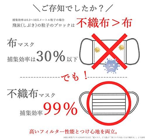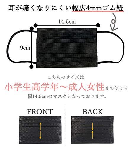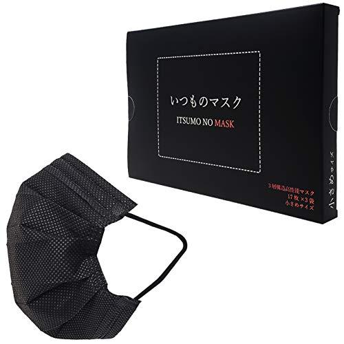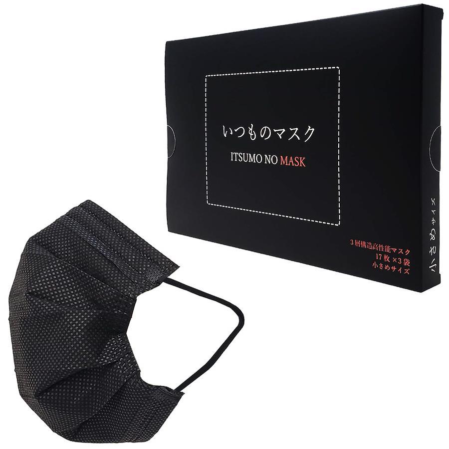 【シンプルなデザインのパッケージと、機能性に優れた3層構造不織布マスク】いつものマスクから黒マスク小さめが販売開始。おしゃれな箱のパッケージなので、自分でスポーツ中などの普段使いや大切な誰かへプレゼントにも最適するのもありかもしれません。お洒落なパッケージデザインだけではなく、17枚入り×3袋で小分けされ、合計51枚で入っているマスクそのものもBFE99%などの機能性に優れた商品です。FDAなどの第三者機関認証も獲得しております。この機会にぜひマスク通販黒、不職布タイプの黒マスクをお試しください。 【3層構造フィルター】【耳が痛くなりにくい】3層の不織布構造で微粒子までキャッチ。高いフィルター性能と着け心地を両立。長時間の装着でも耳が痛くなりにくいゴム紐を採用しました。【開きがキレイ、オメガプリーツ】こちらのマスクは他社とは違い、より高度な技術で作った、オメガプリーツを採用しております。開きやすく、横から見た時に一般的なプリーツよりもキレイに広がり、見た目もスッキリとして見えます。【裏面までしっかり黒】弊社の黒マスクは中の不織布まで黒を使った小さめ黒マスクとなっております。そのため透かしても白い不織布が見える、なんてことや、外した時に裏地が白でかっこ悪い、なんてことがなくなります。裏地までしっかり黒にこだわりたい方には必見です。こちらは小さめの黒不織布マスクとなっておりますので、小学生から成人女性まで幅広くお使い頂けます。 【BFE(微粒子ろ過効率)99%】3層構造の弊社の不織布製の黒マスクは、第三者検査機関にてBFE99%を実証されております。また、いつものマスクはヒトの粘膜を刺激しシックハウス症候群の原因となる有害化学物質である【ホルムアルデヒドは不検出】となっているため、安心してお使い頂けます。【17枚×3袋の少量包装】なので、女性のバッグにちょうどよく、持ち運びにも便利、保管に便利な薄型箱でお届けします。50枚+1枚のちょっとお得な不織布黒マスクです。個包装に比べてゴミが少ないエコな商品です。 【ちいさめサイズ/14.5x9cm】【17枚×3袋の合計51枚入り】【取り出しに便利なポケットティッシュタイプ】【カラー:ブラック】【生産国中国】【第三者認証取得】こちらの不織布黒マスクは日本製ではありませんが、長年にわたり日本向けの輸出実績があり、信頼のできるマスク専門工場から直接仕入れを行っているため、国産と同じ品質と低価格を両立しております。万が一黒マスクの品質に関して不備がございましたら、当店までご連絡いただければ誠心誠意ご対応させていただきます。 【いつものマスクについて】弊社のBFE99%の3層構造不織布マスクは、長時間の装着でも耳が痛くなりにくいゴム紐を採用。またマスクが口にくっつきにくく、呼吸しやすいマスクです。小さなお子様にご使用頂く分だからこそ、ノーズフィッターやオメガプリーツなど、肌触りや着け心地を追求し細部にまでこだわりました。ノーズフィッターは樹脂でできているので可燃ごみで捨てられます。他社とは違い裏地まで黒を使用しているので、外した時にも違和感がありません。【ご購入する前に】本品は感染を完全に防ぐものではありません。感染防止のため、他の方とマスク使い回し、共用などは避けてください。【当店について】商品に関するご意見など気になる点がございましたらお気軽にカートボックス下の「GP-RECX」から「質問する」よりご連絡ください。誠心誠意ご対応させていただきます。