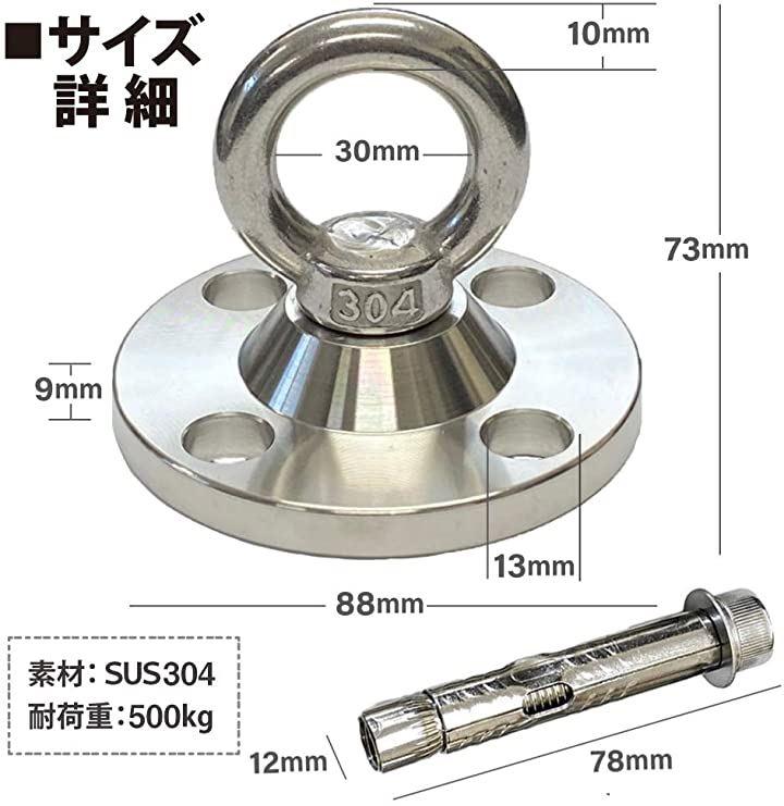 素材:SUS304(クロムステンレス)耐荷重:500kg直径:88mm 底厚み:9.0mm穴径:13.0φmm内容物・フック金具・コーチスクリューx4本・アンカーx4本