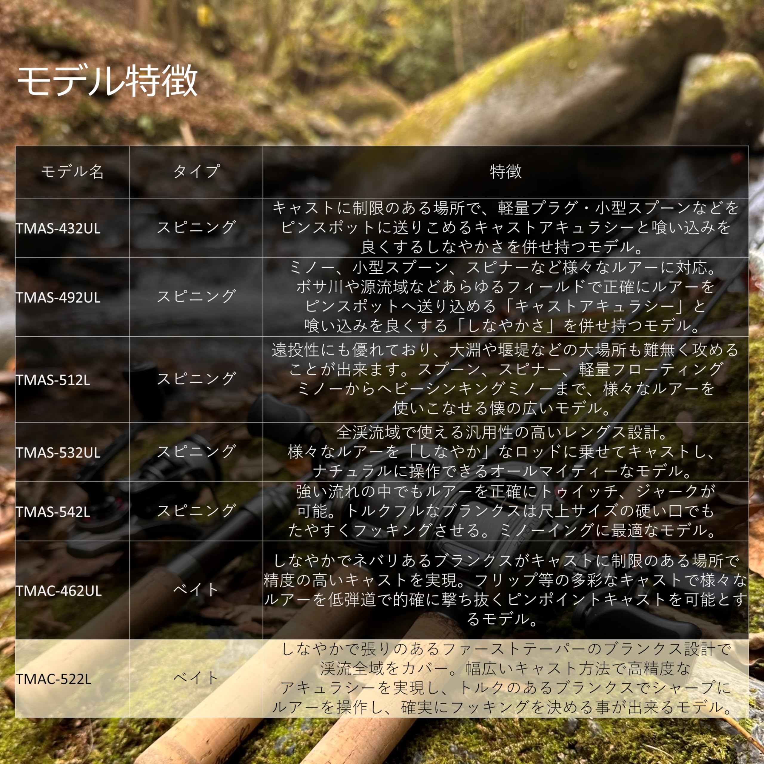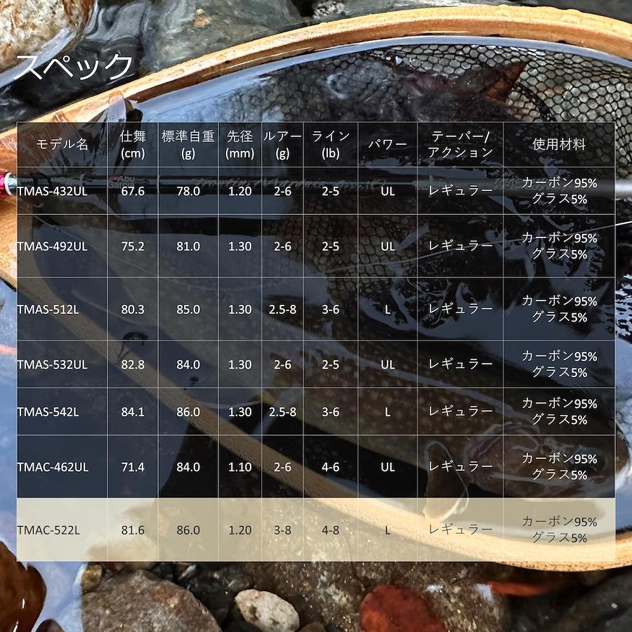 「ネバリあるしなやかさ」を追求した進化系ネイティブトラウトロッド。東レ「T1100G」をティップセクションに使用し、感度と強度の両方を高い次元で実現。リールシートにはオリジナルの木製リールシートを使用することで高級感を演出。