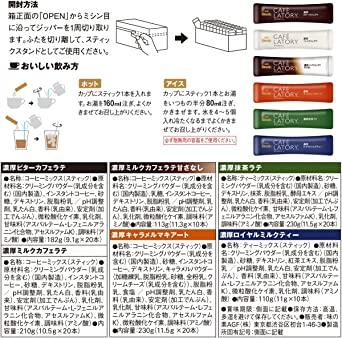 メーカー名:AGFブランド名:カフェラトリー商品タイプ:スティック原産国:日本セット内容:【濃厚ビターカフェラテ】【濃厚ミルクカフェラテ】【濃厚キャラメルマキアート】【濃厚抹茶ラテ】【濃厚ミルクカフェラテ甘さなし】【濃厚ロイヤルミルクティー】賞味期限:製造日から 480 日おいしい飲み方:1、カップにスティック1本を入れる。2、お湯を160ml注ぐ。 point:沸かしたての熱いお湯で。 ※やけどにお気をつけください。3、すぐに10秒程よくかき混ぜて完成スティック1本あたり内容量:【濃厚ミルクカフェラテ】 10.5g、【濃厚ビターカフェラテ】 9.0g、【濃厚キャラメルマキアート】 11.5g、【濃厚抹茶ラテ】 11.5g、【濃厚ミルクカフェラテ 甘さなし】 11.3g、【濃厚ロイヤルミルクティー】 11g、アレルゲン:乳成分保存方法:高温、多湿を避けて保存してください。【重要】メーカーによる商品リニューアルに伴いパッケージ(内容量も含む)変更が行われた場合、新パッケージでお届け致します事ご了承願います。