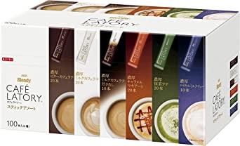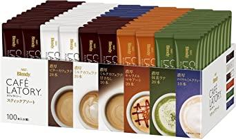 カフェ専門店の職人がこだわりと情熱を注ぎ生み出した「Blendy(ブレンディ) カフェラトリー」は、スティック1本で手軽に専門店の味わいが楽しめる、高品質なインスタント スティックシリーズです。AGF(エージーエフ) 「ブレンディカフェラトリー」 スティック アソート100本は、カフェの6つのメニューを詰め合わせた多品種大容量アソートタイプ。【アソート内訳】濃厚ビターカフェラテ20本、濃厚ミルクカフェラテ 20本、濃厚キャラメルマキアート20本、濃厚抹茶ラテ20本、濃厚ミルクカフェラテ甘さなし10本、濃厚ロイヤルミルクティー10本1杯1杯が開けたてを楽しめる個包装スティックタイプ。お湯を淹れた瞬間に泡立つ、専門店の本格的な味わいをお楽しみください。目を閉じて味わいたいほどの、1杯を。ご堪能下さい。スティック1本にいつもの半分のお湯と氷を入れれば、簡単にアイスもお楽しみいただけます。おしゃれな包装なので、母の日や父の日、バレンタインやホワイトデーなどの記念日にカフェ好きの方への手土産やプチギフトにもぴったりです。