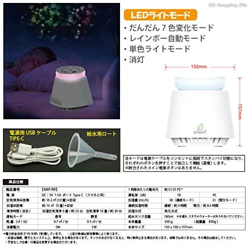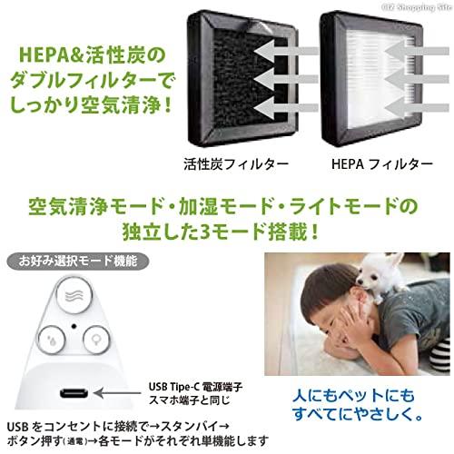 通常1-5営業日で発送:【仕様】 ・電源:DC15V 1.5A ポート/Type-C(スマホと同じ) ・消費電力5W ・空気清浄床面積:約16.2m2(10畳) ※目安 ・加湿床面積:約15m2(9畳) ※目安 ・清浄時間(目安):加湿空気清浄9畳/約23分、空気清浄10畳/約20分 ・運転モード:通常、静音 ・風量:通常0.7m2/分、静音0.5m2/分 ・運転音:通常50dB、静音45dB ・加湿量:連続モード36ml/h、間欠モード21ml/h ・連続加湿時間:連続モード/約5時間、間欠モード/約8.5時間 ・加湿方式:気化方式 ・給水タンク容量:180ml ・本体重量:650g(総重量850g) ・本体サイズ:150×150×157mm 【付属品】 ・電源用USB Type-cケーブル ・給水用ロート 【ご注意】 ※水道水、ミネラルウォーター以外入れないでください。