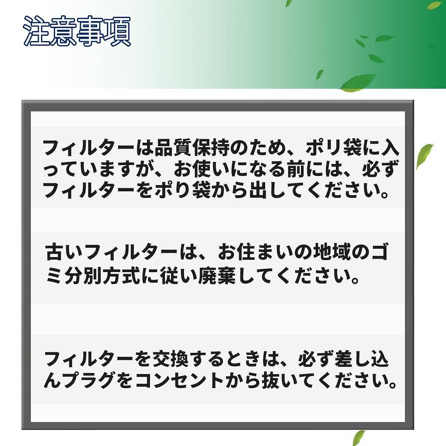 注意事項:※お手入れは、約2週間に1回です。おもて面のホコリを掃除機などで取ります。※水洗いは、絶対にしないでください。(フィルターの性能を損ないます)※使用環境や使い方によってフィルターの交換時期が極端に短くなること