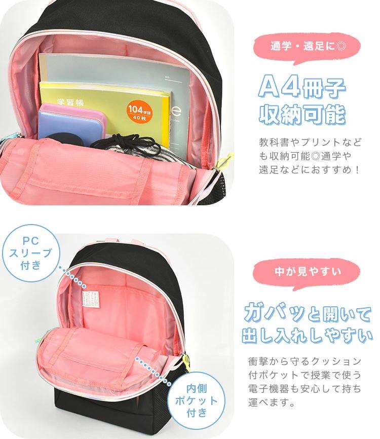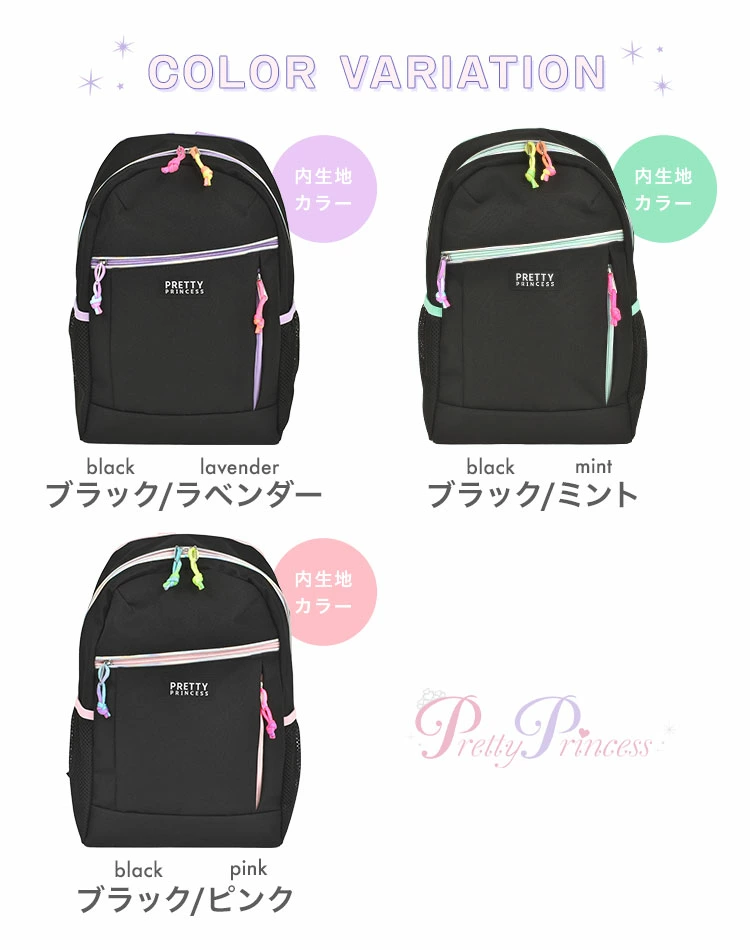 【拡張デイパック】ブラックにカラーのファスナーがおしゃれなプリティプリンセスのリュックサック。背面側のファスナーを開くと容量を拡張可能!学校やお出かけ先で荷物が増えた時も安心です◎A4が収納できるサイズで、PCスリーブ付きなので授業等で使う電子機器も安心して持ち運べます◎