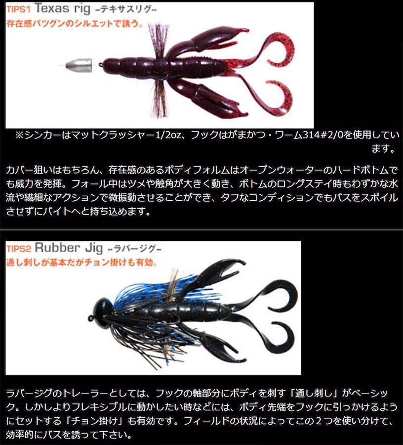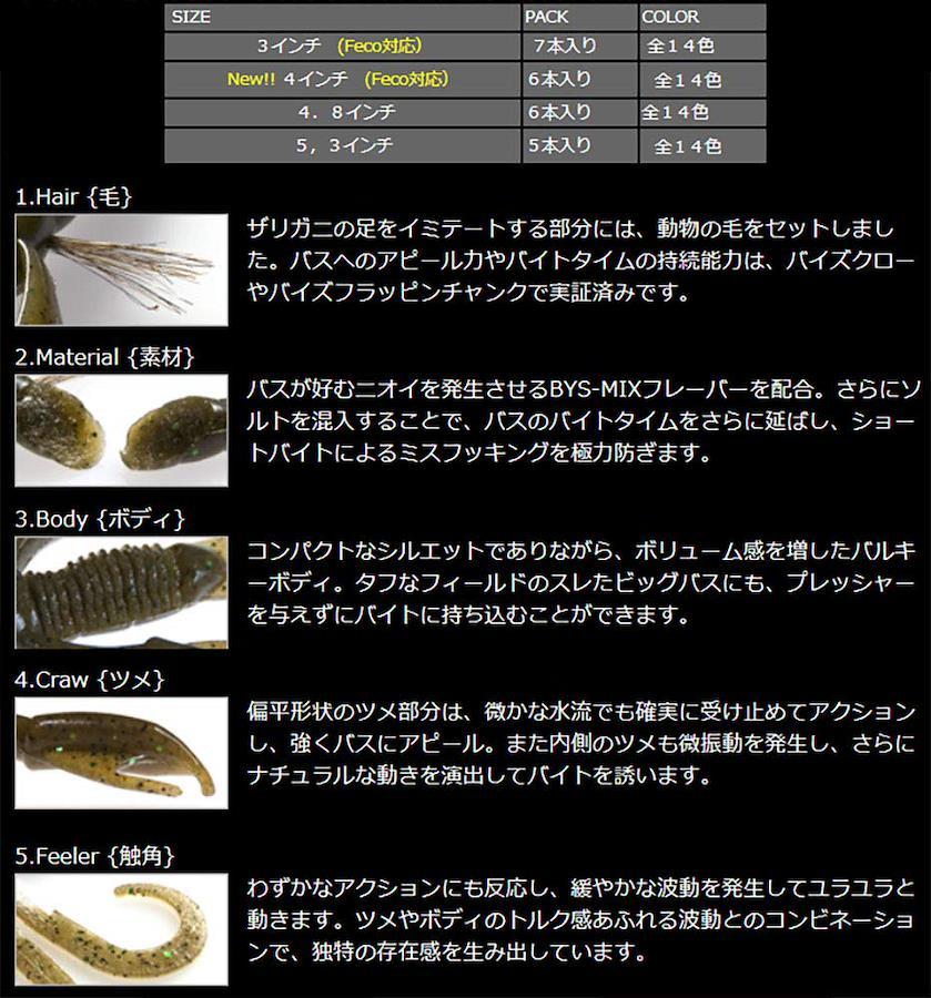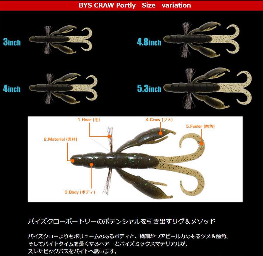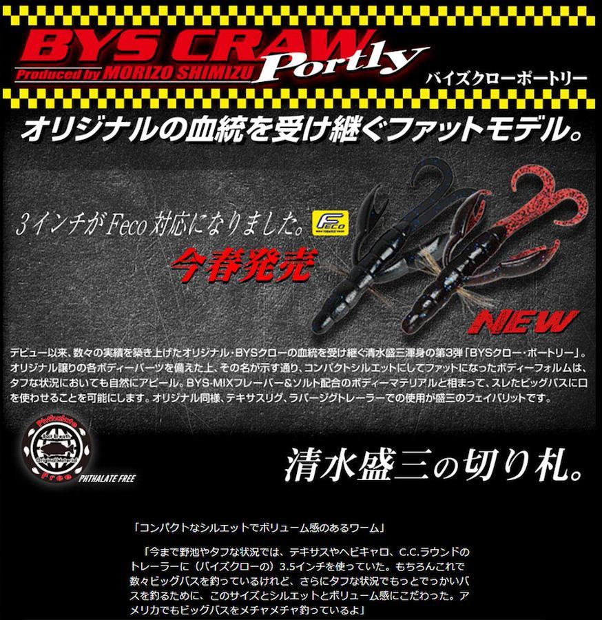 デビュー以来、数々の実績を築き上げたオリジナル・BYSクローの血統を受け継ぐ清水盛三渾身の第3弾「BYSクロー・ポートリー」。オリジナル譲りの各ボディーパーツを備えた上、その名が示す通り、コンパクトシルエットにしてファットになったボディーフォルムは、タフな状況においても自然にアピール。BYS-MIXフレーバー&ソルト配合のボディーマテリアルと相まって、スレたビッグバスに口を使わせることを可能にします。オリジナル同様、テキサスリグ、、ラバージグのトレーラーでの使用が盛三のフェイバリットです。