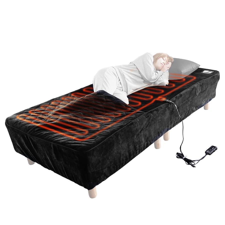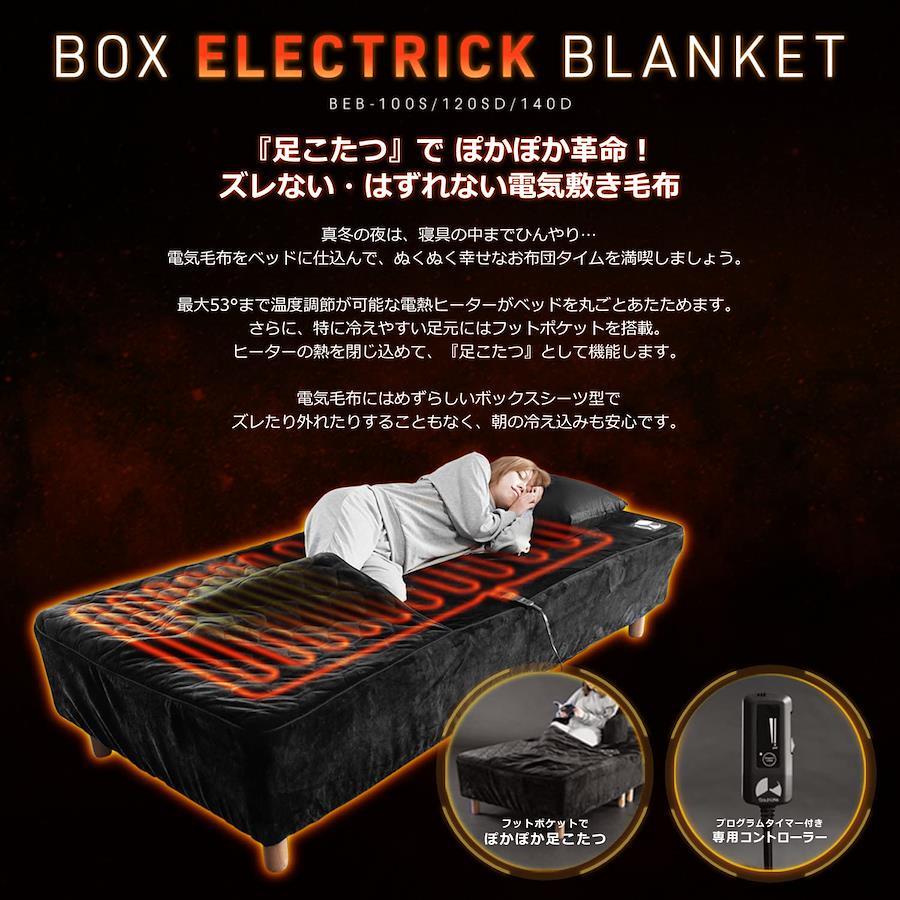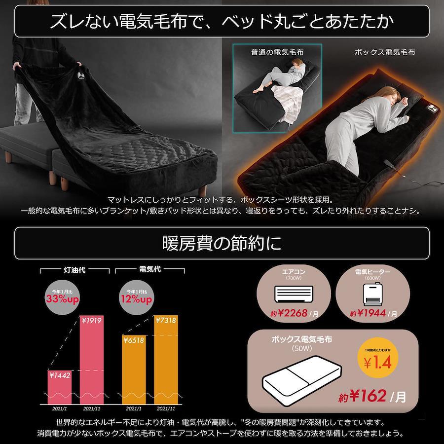 3営業日以内に発送≪新品未開封品≫:【Bauhutte ボックス電気毛布】「足こたつ」でぬくぬくズレない・はずれない電気敷き毛布【ストーリー】あったかいベッドで眠ろう。電熱ヒーター×足こたつ搭載のボックスシーツ【足こたつ機能】真冬の夜は、ベッドに入っても足先がキンキンに冷えて寝付けない...そんな悩みを解決する、フットポケットを搭載しています。綿を挟んだキルト生地で保温性を高め、冷たい外気をブロック。ヒーターの熱であたたまった内部は、まるで『こたつ』の中のようにポカポカです。【頭は冷やして、足はぽかぽか】電熱ヒーターは、足元にむけて本数が多くなるよう調整しています。熱がこもりやすい頭部を避けて、冷えやすい足部をしっかりとあたためられる配置です。【ズレない電気毛布で、ベッド丸ごとあたたか】マットレスにしっかりとフィットする、ボックスシーツ形状を採用。一般的な電気毛布に多いブランケット/敷きパッド形状とは異なり、ごろごろ寝返りをうっても、ズレたり外れたりすることがありません。ベッド全体をしっかりとカバーして、あたたかい布団で朝まで快適に眠れます。【暖房費の節約に】世界的なエネルギー不足により、"冬の暖房費問題"が深刻化してき
