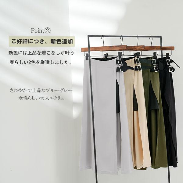 【デザイン】ダブルベルトデザインのレイヤード風スカートです。ミニスカートの上にラップ風デザインを重ねています。サイドスリットから脚をチラ見えできて、色っぽい印象に。後ろウエストがゴムなので着脱も簡単です。スタイリングしやすいワンカラーとコーデの主役になる配色デザインをご用意。