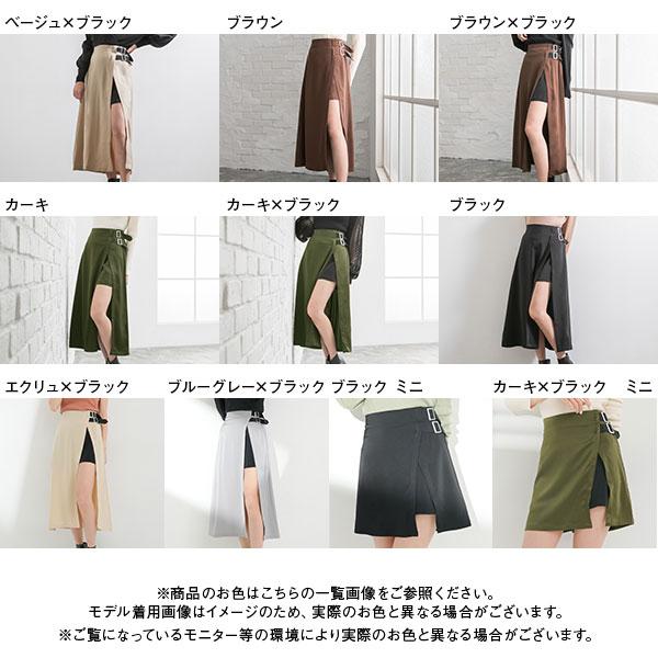 【デザイン】ダブルベルトデザインのレイヤード風スカートです。ミニスカートの上にラップ風デザインを重ねています。サイドスリットから脚をチラ見えできて、色っぽい印象に。後ろウエストがゴムなので着脱も簡単です。スタイリングしやすいワンカラーとコーデの主役になる配色デザインをご用意。