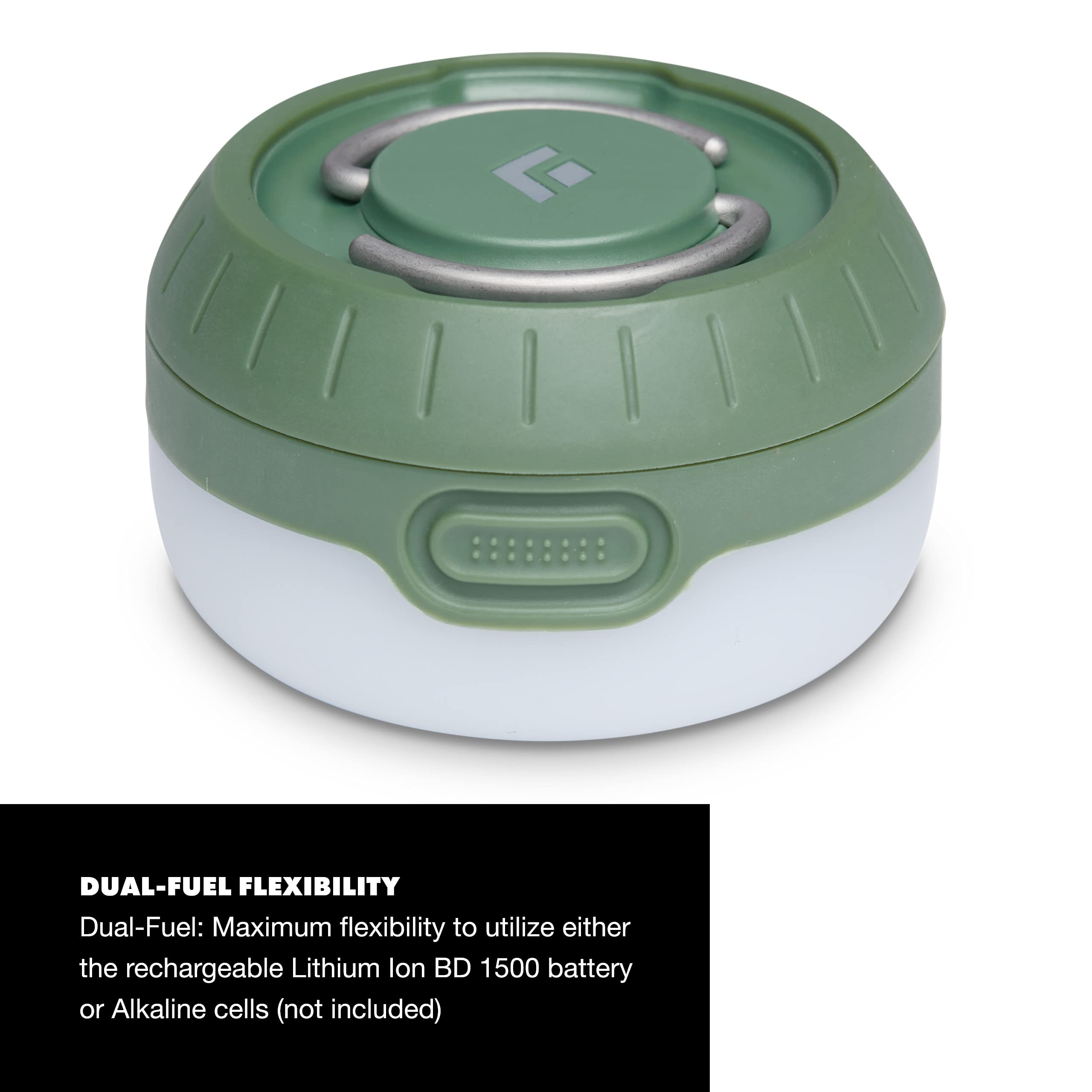 吊り下げたり、テーブルに据え置きしたり、多目的に使えるキャンプ用ランタン。2022年モデルは100ルーメンから150ルーメンに照度アップ。BD1500バッテリー(別売)もしくはアルカリ乾電池のいずれかを使用できるデュアルフューエルモデルに進化しました。・BD1500バッテリーもしくはアルカリ乾電池(別売)を使用できます・自然な照明を生み出す艶消しのホヤ・吊り下げやすいダブルフック・IPX4(いかなる方向からの真水の飛沫にも影響を受けない)【全光束】150ルーメン【電池寿命】100時間(低照度)【電池】単4アルカリ電池×3本(別売)【重量】122g【サイズ】直径7cm×高さ4.5cm (実測値)【防水等級】IPX4(いかなる方向からの真水の飛沫にも影響を受けない)-