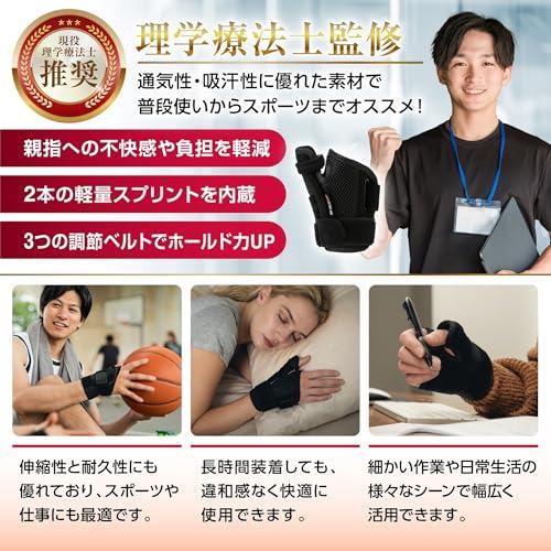 【 人体構造設計 】 家事、育児、仕事などの日常生活で手首や指の付け根を守ります。手を過度に使用すると、腱や関節をこすって不快感を引き起こす可能性があります。そんな時に親指付け根サポーターが活躍します!親指を通すホールの縁に施されたホールロック構造が親指の付け根にぴったりとフィットします。日常生活での使用に最適! 【親指サポート】2本の添え木付きで、親指周囲の形状に合わせた弯曲したプラスチックステーを採用しています。三次元に親指をサポートし、親指の過度な屈曲と反り返りを防止します。 親指をしっかりと保護 サポートします。 【優れた通気性&蒸れにくい素材】通気性のよい素材を採用し。内側部分は吸汗性に優れた素材を使用し 外側は通気性の良いメッシュ素材の二重構造です。余分な熱や汗を発散しやすく長時間サラサラをキープ。 【 男女兼用&左右兼用 】 本製品は、ワンサイズの男女兼用で使用していただけます。左手右手通用タイプです。軽量で持ち運びにも便利ですので、お出かけの際カバンに入れているといつでも使用していただけるので便利です。