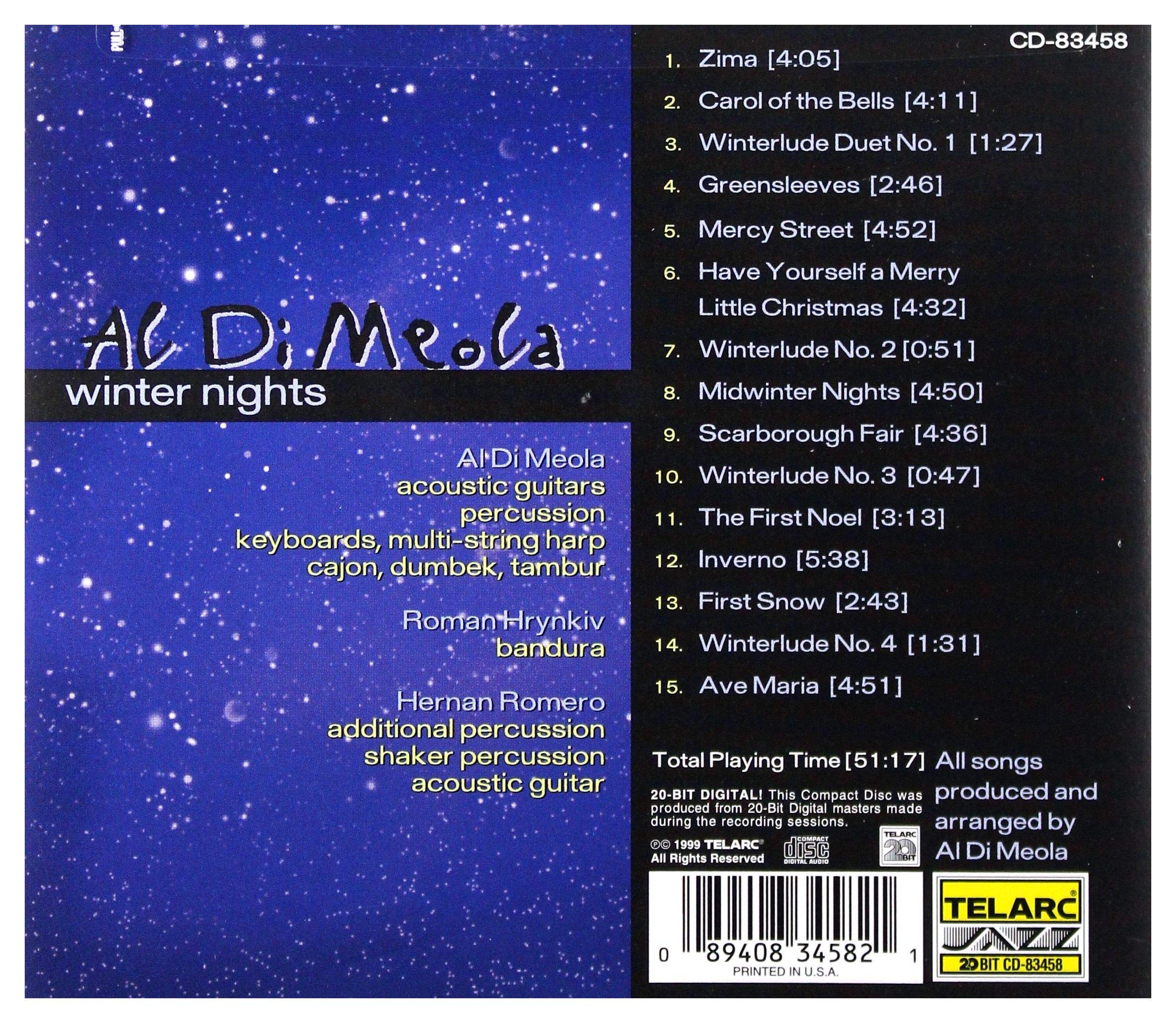Jazz guitarist Al DiMeola gives new meaning to the phrase world music by working with Ukrainian bandura player Roman Hrynkiv. Here DiMeola explores a special collection of instrumental seasonal works, underscoring them with layered percussion. A number of captivating originals and intricately arranged standards surface here, including "Carol of the Bells, "Ave Maria," and "The First Noel." DiMeola certainly titled the album right: these seasonal songs readily capture the penetrating chill and peacefulness of a star-laden winter sky. Recommended. --Martin Keller