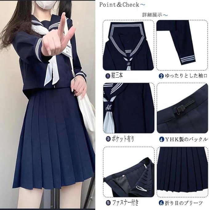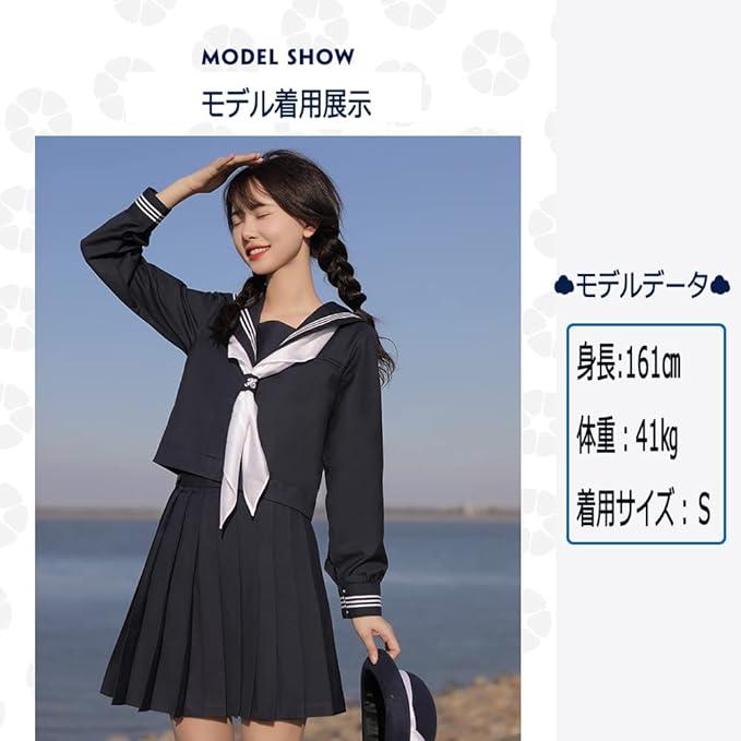 おしゃれなデザイン:正統派らしい三本線デザインされた女子高生セーラー服。袖口や襟には全体の紺色と違いの白いストライプを採用され、ネクタイリボンと合わせ、女子可愛さ増え...