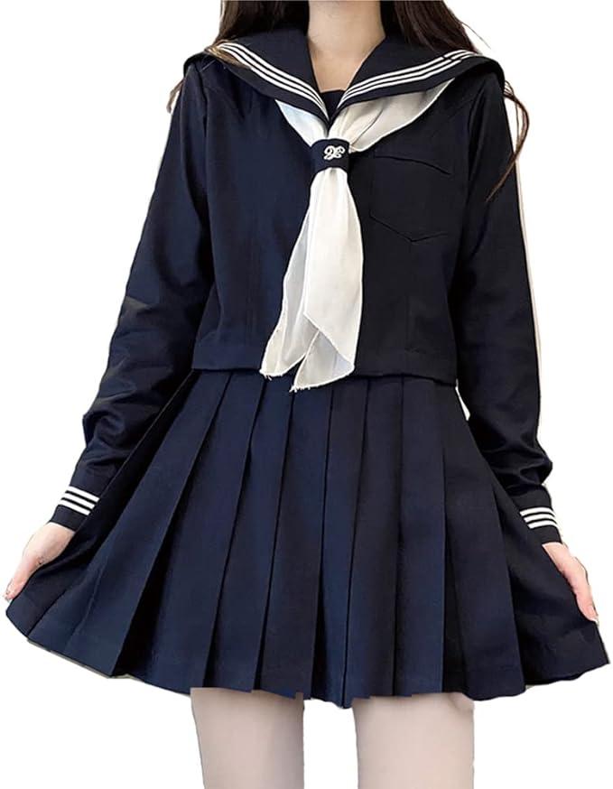 ■商品名[City Sea Sky] セーラー服 長袖 上下セット 女子高生 スクール制服 学生服 清純コスプレ コスチューム 4点セット 紺三本 セーラー服 コスプレ レディース 関西襟 前開き 中学生 通学 入学式 修学旅行 紺色 仮装 ハロウィン 大人 (スタイル1-ネイビー%カンマ% 5XL)