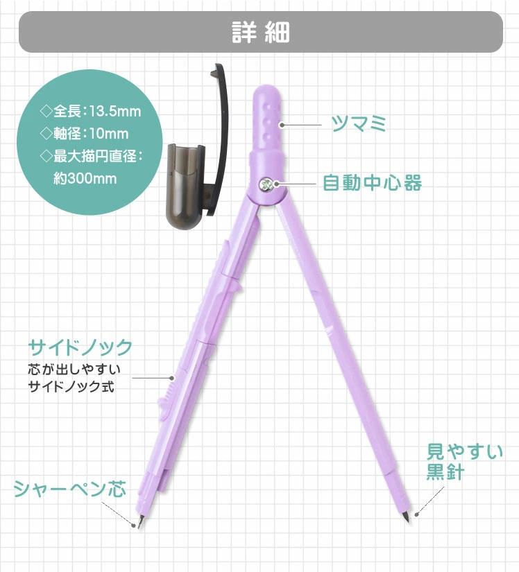 2008年の発売以来、ベストセラー商品である「ペンパス シャープタイプ」を、ペンケースに入るスリムなペンタイプの形状はそのままに、新たな機能を追加してさらに使いやすくリニューアルしました。市販の0.5mmシャープペンシル芯を使うことができるため、お手持ちの替芯やカラーの替芯等を使っての描円が可能。紙上で視認性の高い黒針を採用しています。針や芯先を守って携帯に便利なキャップ付きです。