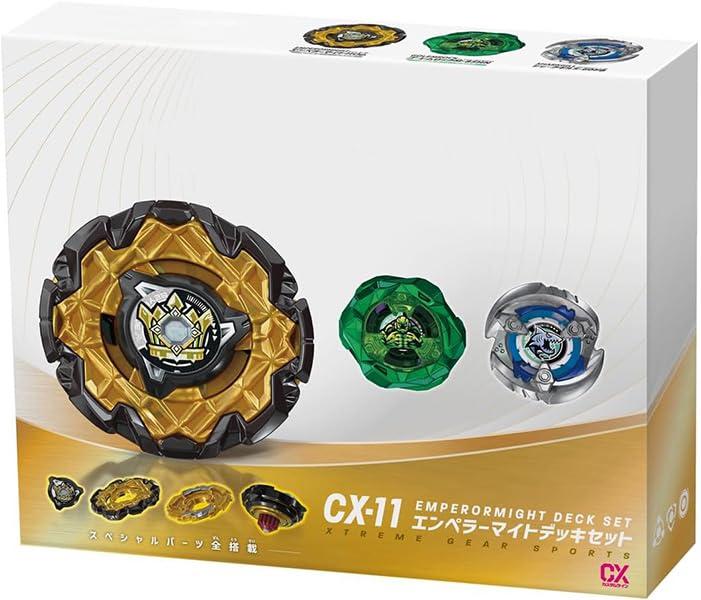 超加速ギミック【Xダッシュ】による驚異的なスピードと衝撃でエクストリームなバトルを繰り広げるギアスポーツである。ベイが3個入っており、3on3バトルやカスタマイズがすぐに楽しめるデッキセット。中でも「エンペラーマイトHOp」は全て重量級のパーツで構成されたブレードに、性能を切り替えられるビットを組み合わせ、重量級防御と重量級攻撃の2つのスタイルに切り替えが可能なベイ。※この製品で遊ぶには別売りの専用スタジアム、ランチャーが必要です。