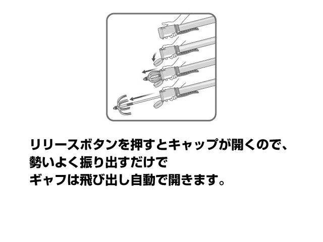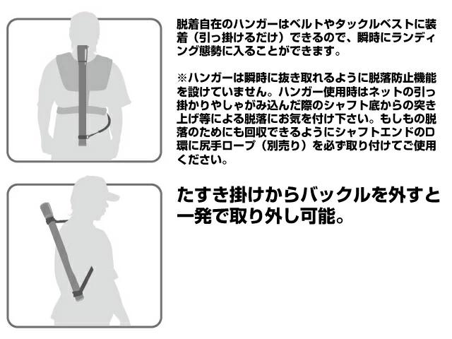 収納時にはセーフティーカバーとキャップはロックされているのでギャフが不意に飛び出しません。リリースボタンを押すとキャップが開く新機構を採用。あとは勢いよく振り出すだけでギャフが飛び出し自動で開き、アオリイカを掛けるとシャフトが曲がり針先が上を向くのでバラシにくく片手だけでの素早いランディングが可能です。服装や状況に合わせてハンガースタイルとショルダーストラップスタイルが選択できます。