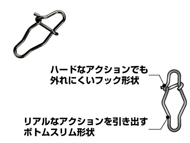 取り付けやすく、外れ難いスナップ形状は、フック部を大きくし、内向き曲げることでシャクリやダート時の衝撃によるはずれを防ぎます。