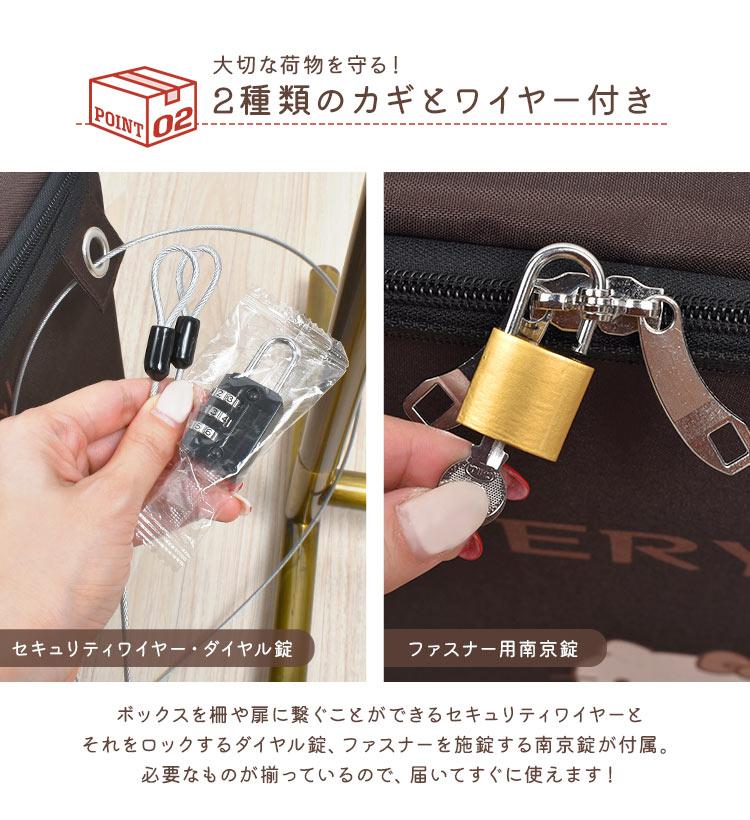 ■付属品南京錠(鍵2個付き)、ダイヤル錠、セキュリティワイヤー、取扱説明書