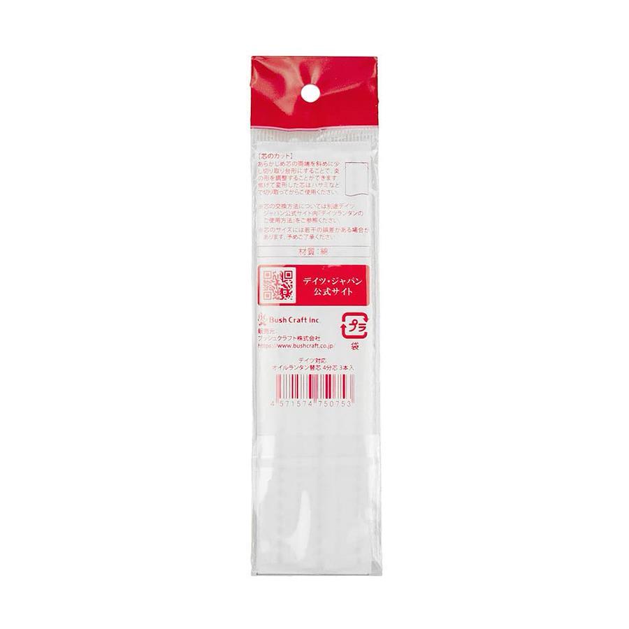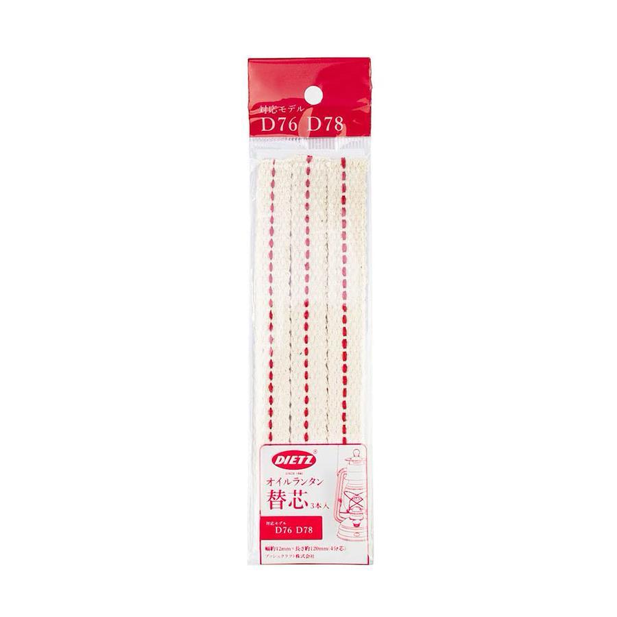 DIETZオイルランタン対応の替芯 4分芯 3本入です。【サイズ】幅:約12mm/長さ:約120mm/厚さ:約1.8mm【重量】約1.3g【素材】綿【対応モデル】D76、D78※芯の長さには若干の誤差がある場合があります。予めご了承ください。