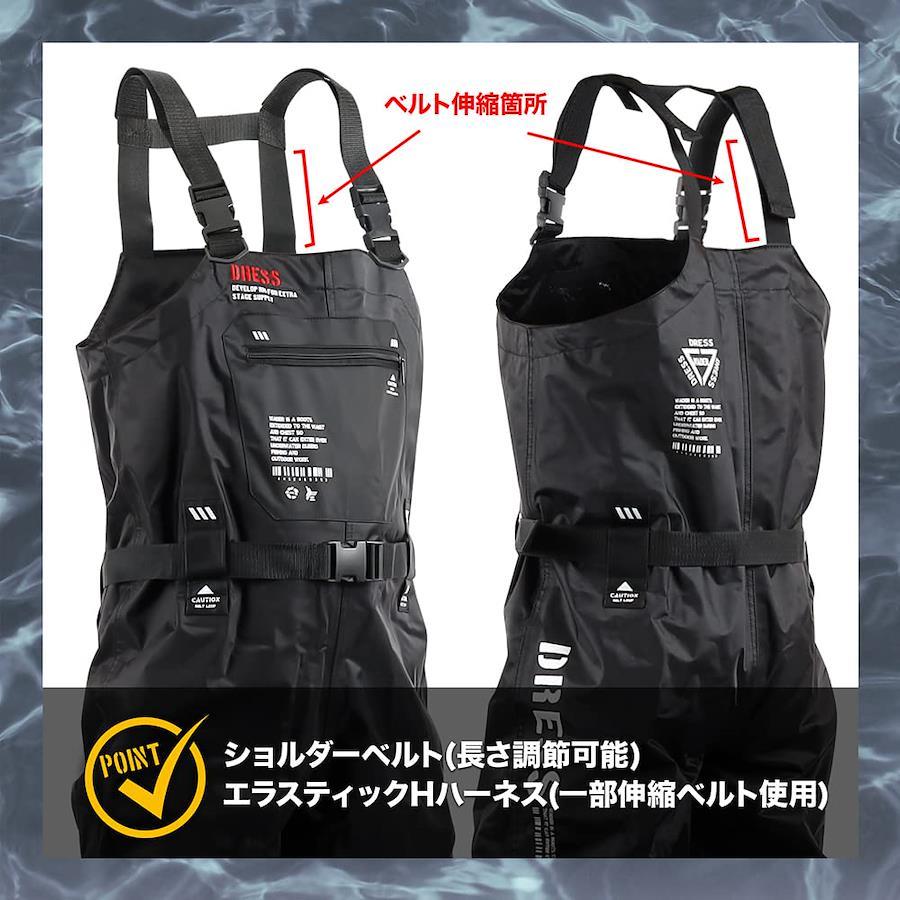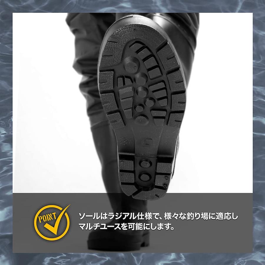 ●様々な釣り場に対応するラジアルソール仕様!●軽くて動きやすいナイロン生地、スレに対して強く保温性もある素材です。●転倒時の水の浸入を抑えるウエストベルト付き●ベタつきを抑えるインナーメッシュ●肩への負担を軽減し、動きやすいエラスティックHハーネス仕様。
