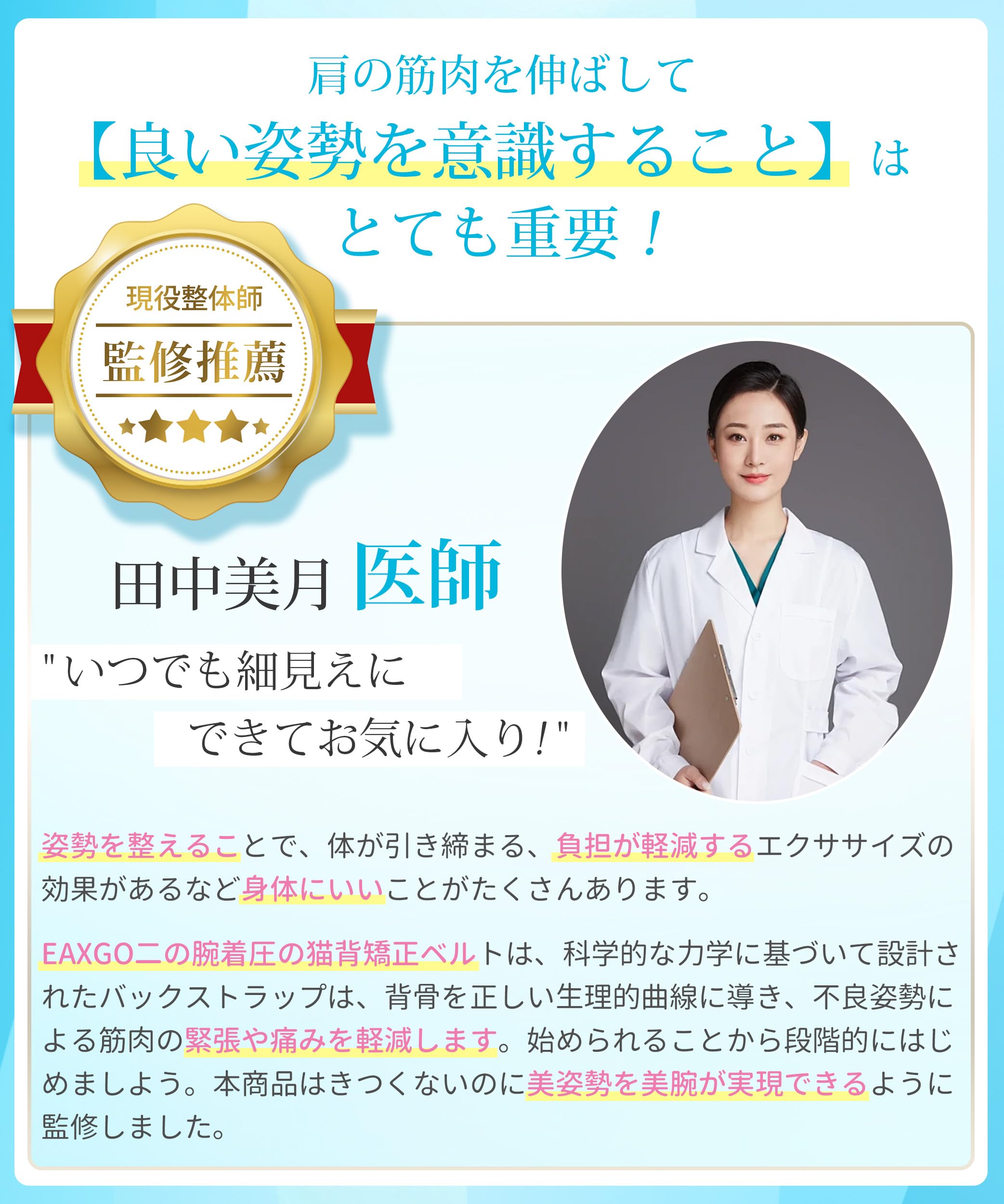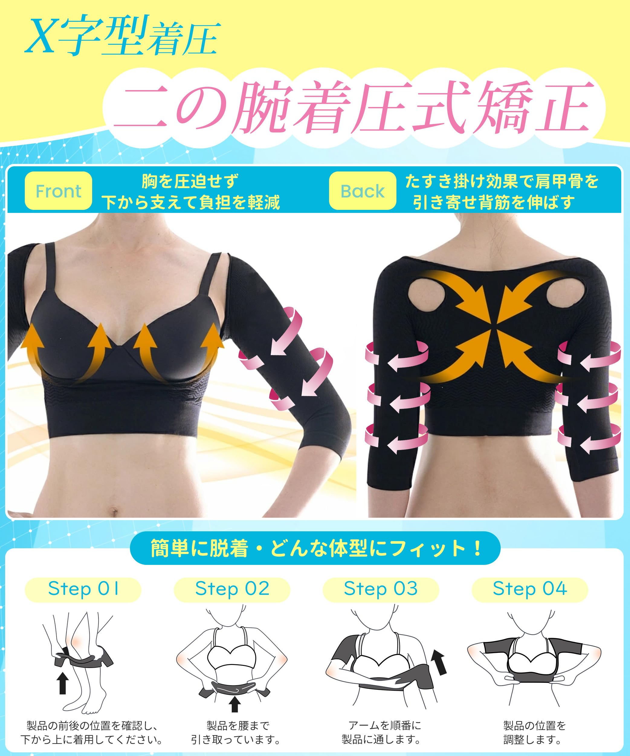 ?【現役整体師監修・猫背矯正】長時間のデスクワークやスマートフォンを見下ろす姿勢、猫背など、これらの悪い習慣は脊椎の健康に悪影響を与える可能性があります。この問題を解決するために、現役整体師が丹精込めて開発したEAXGO二の腕 着圧の猫背矯正ベルトは、健康的な姿勢を取り戻すために設計されています。この姿勢矯正ストラップの最大の特徴は、独自の矯正メカニズムにあります。?科学的な力学に基づいて設計されたバックストラップは、背骨を正しい生理的曲線に導き、不良姿勢による筋肉の緊張や痛みを軽減します。EAXGO二の腕 着圧の猫背矯正ベルトを長期間着用することで、姿勢改善のみならず、頸椎症や腰椎症などの脊椎関連疾患の予防にも効果が期待できます。 ?【着るだけで姿勢美人】EAXGO 二の腕シェイパーは、完璧な姿勢を保つためにどのような効果があるのでしょうか?まず、背中と首を効果的にサポートし、長時間の座位や立位でも背中が曲がったり疲れたりするのを防ぎます。次に、胸をまっすぐに保ち、胸の垂れや猫背を防止できます。?合理的なカッティングとサポート力のあるデザインにより、バストラインを強調し、バストをより豊かでハリのあるものに見せることができます。さらに、背中と肩のサポートを調整することで、二の腕のラインを改善し、肩の安定性を高め、肩のたるみを防ぐことができます。また、背中の筋肉の緊張を緩和し、背筋を伸ばすことで、目に見えてスリムな体型を実現します。二の腕シェイパーは、さまざまな健康上の問題を予防・改善するだけでなく、美しいボディラインを形成し、自信とイメージを高めるのにも役立ちます。 ?【X字型着圧・二の腕着圧式矯正】EAXGOの二の腕 着圧の背中のX字型デザインは、力学原理を巧みに応用しています。クロスしたX字型構造により、背中にかかる圧力が全体に均等に分散され、立っている時、歩いている時、運動している時でも快適さを保ちます。従来の猫背矯正ベルトは締め付けが強すぎて不快に感じることが多かったですが、EAXGOの製品は着心地を犠牲にすることなく、余分な背中の脂肪を効果的に引き締め、締め付けによる圧迫感を感じることなく、タイトでシェイプアップされたフィット感を実現します。EAXGOの二の腕 着圧は、二の腕に加圧すると同時に凹凸編み技術を採用し、脂肪への均一な加圧と再成形を実現します。?この技術は脂肪を効果的に固定するだけでなく、着用者が運動中に過度な緊張や不快感を感じないことを保証します。二の腕を引き締めるだけでなく、体のラインをより優美に見せ、自信に満ちた魅力を引き出します。このデザインはシェイプのニーズを満たすだけでなく、着用者の快適さも両立しています。 ?【長時間でも快適続く・自然な補整】従来の肩 サポーターは、着用時に脇が痛くなり、長時間の着用が難しいという問題がありました。そこで、EAXGOの二の腕 着圧は、通気性に優れた素材を使用しているため、長時間装着していても蒸れず、快適な着け心地を提供します。さらに、二の腕 着圧は柔軟性があり、痛みを感じることなく自由に伸び、呼吸しやすく、着用も簡単です。?通気性と弾力性に優れたEAXGOの二の腕 着圧は、肩を後ろに引き、肩甲骨を引っ張ることで猫背矯正の役割を果たします。正しい姿勢は健康に寄与するだけでなく、個人的なイメージと自信を高めることにもつながります。 ?【簡単に脱着・どんな体型にフィット!】シンプルなデザインで、誰でも簡単に装着できます。?日常生活でも激しい運動でも、動きに十分なゆとりがあり、二の腕シェイパーにありがちな締め付け感を気にせず、さまざまな動きを楽に、快適に行えます。さまざまな人々のニーズを考慮したデザインなので、勉強中でも仕事中でもレジャー中でも、気軽に着用して健康的なライフスタイルを楽しむことができます。