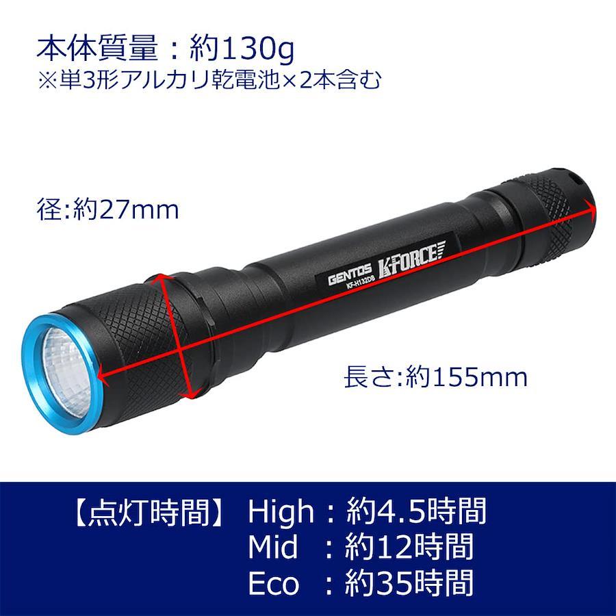 エネループ・充電式エボルタ使用可能3段階調光機能テールスイッチANSI規格準拠サイズ:約直径27×155mm、本体重量:約130gセット内容・付属品:本体、ストラップ、テスト用電池 (単3形アルカリ電池×2本)明るさ:High/390ルーメン、Mid/190ルーメン、Eco/60ルーメン、使用電池:単3形アルカリ電池×2本実用点灯:High/4.5時間、Mid/12時間、Eco/35時間機能:2m落下耐久、耐塵・防滴仕様 (IP64準拠)、最大照射距離:約87m