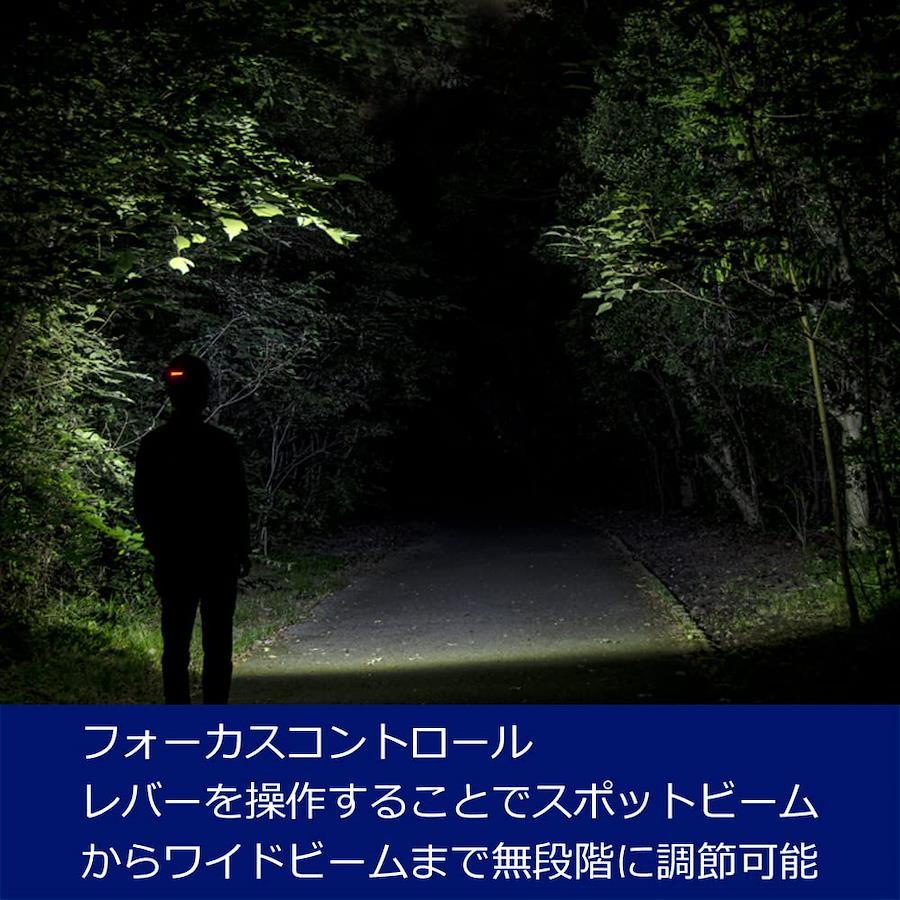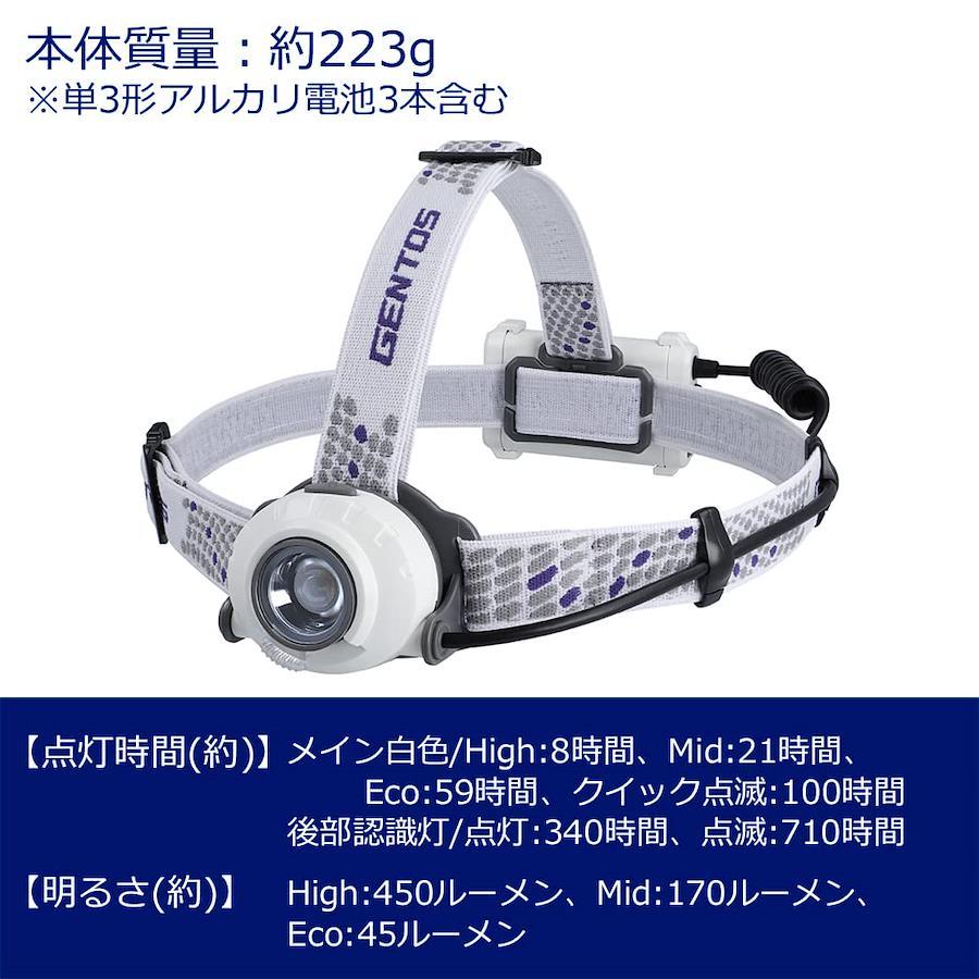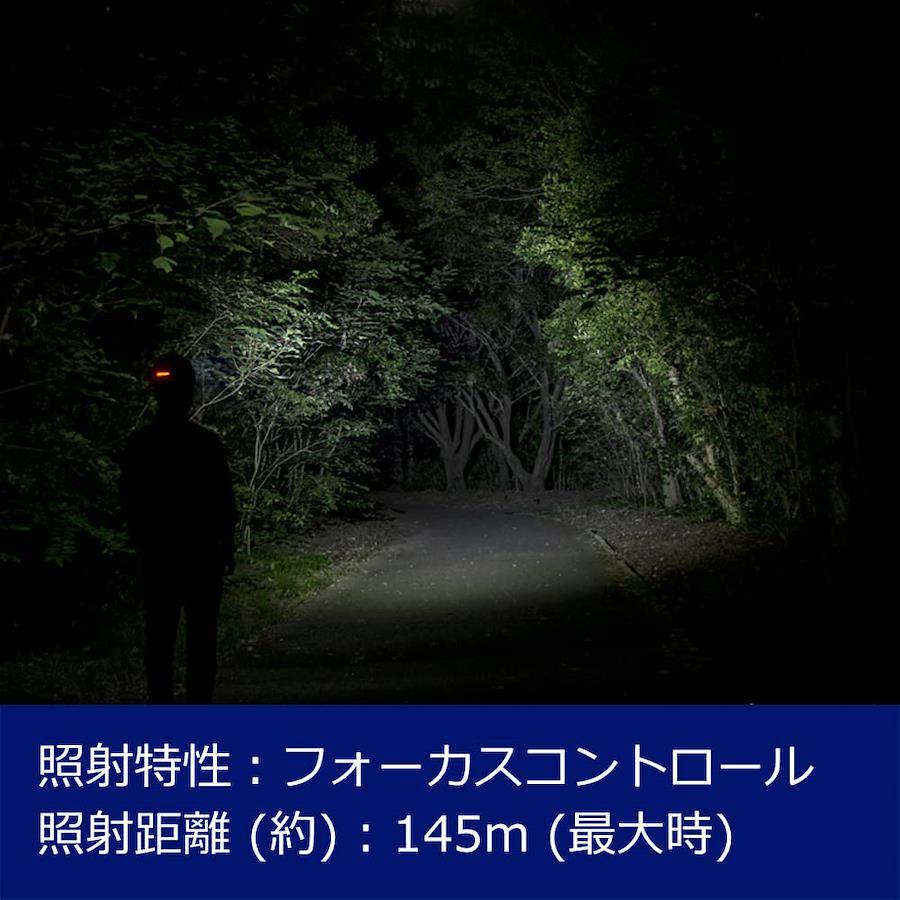 銀イオン抗菌加工ヘッドライト 後部認識灯搭載で後方の安全性を確保 乾電池/専用充電池(別売)兼用サイズ(約):ヘッド部/幅73.1×奥行38.8×高さ52.8mm、電池ボックス部/幅84.8×奥行30.4×高さ53.8mm、本体重量:約223gセット内容・付属品:本体、すべり止め付きヘッドバンド、シリコンバンド(バックル×4個)、ヘルメットホルダー×4個、テスト用電池(単3形アルカリ電池×3本)明るさ:High/450ルーメン、Mid/170ルーメン、Eco/45ルーメン、使用電池:単3形アルカリ電池×3本 または 専用充電池(別売り)実用点灯:High/8時間、Mid/21時間、Eco/59時間、クイックフラッシュ/100時間、後部認識灯 点灯/340時間、後部認識灯 点滅/710時間機能:1m落下耐久、耐塵・防滴仕様 (IP64準拠)、最大照射距離:約145m
