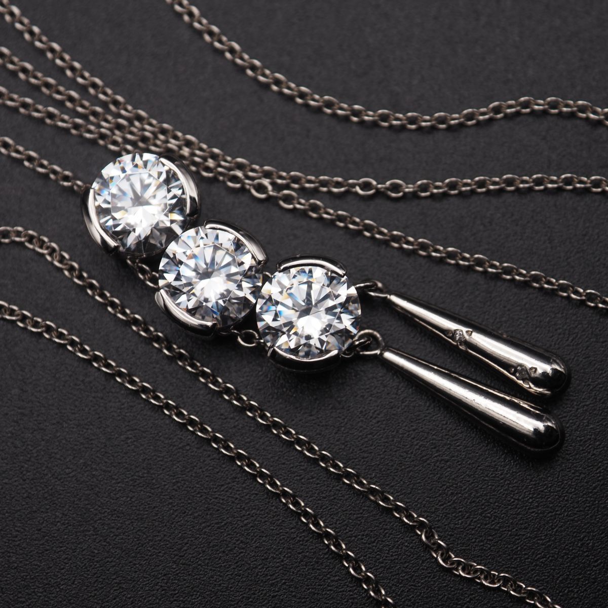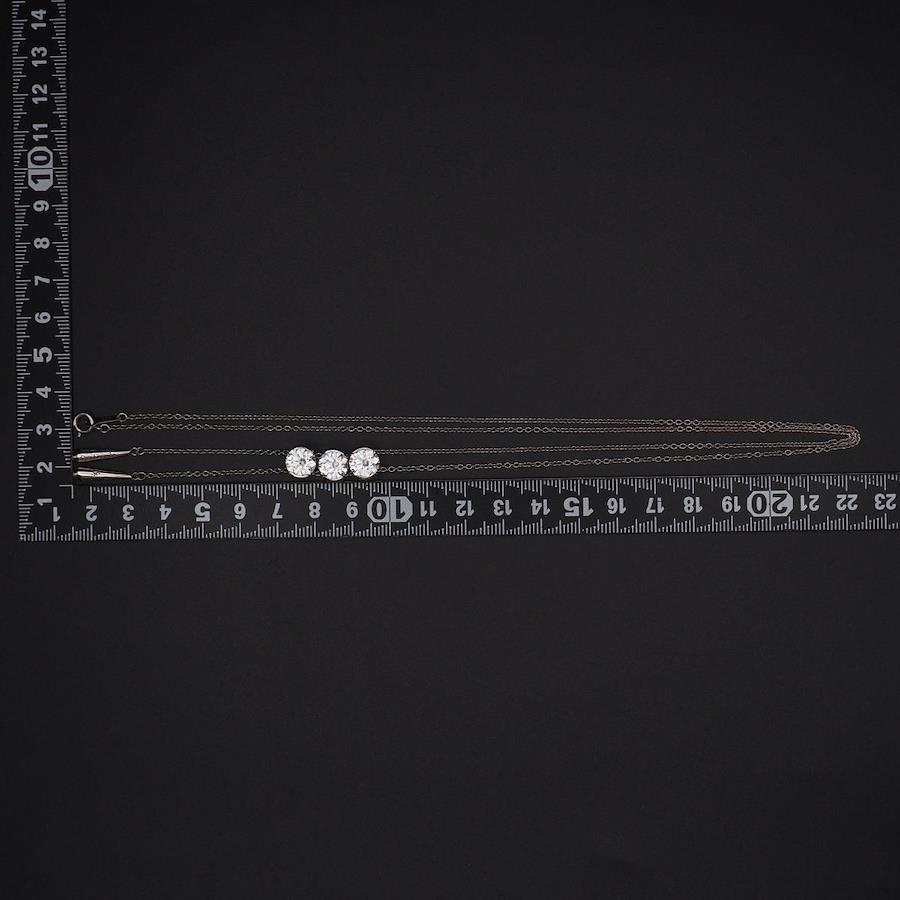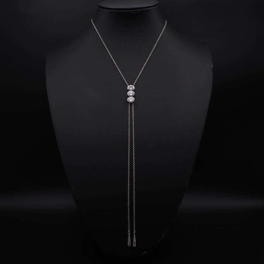 上部の3石はキュービックジルコニアで、下部の6石はダイヤモンドです。チャームがお好みの位置に動かせるタイプのネックレスです。お好きなアレンジで様々なデザインを楽しめます。