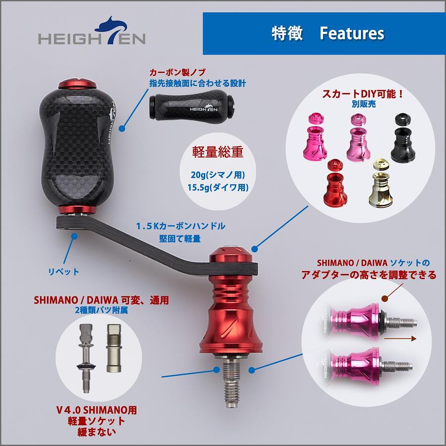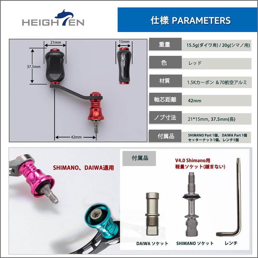 【ライトゲーム 渓流釣り用】1.5K炭素布のハンドル、カーボン製ノブ搭載21mm(幅)x15mm(厚)、全体的に軽量。【サイズ】ハンドル軸心距離42mm、ノブ20mm/21mm(幅)x15mm(厚) 【総重】20g(シマノ用)/15.5g/(ダイワ用)【素材】ハンドル - 1.5K炭素布のカーボン。【リールハンドル付属】SHIMANO ソケット 1個、DAIWA ソケット 1個、レンチ1個。【適応機種】SHIMANO、DAIWAのねじ込み式スピニングリールハンドルの交換に適用。