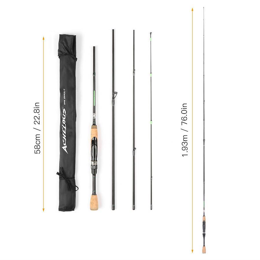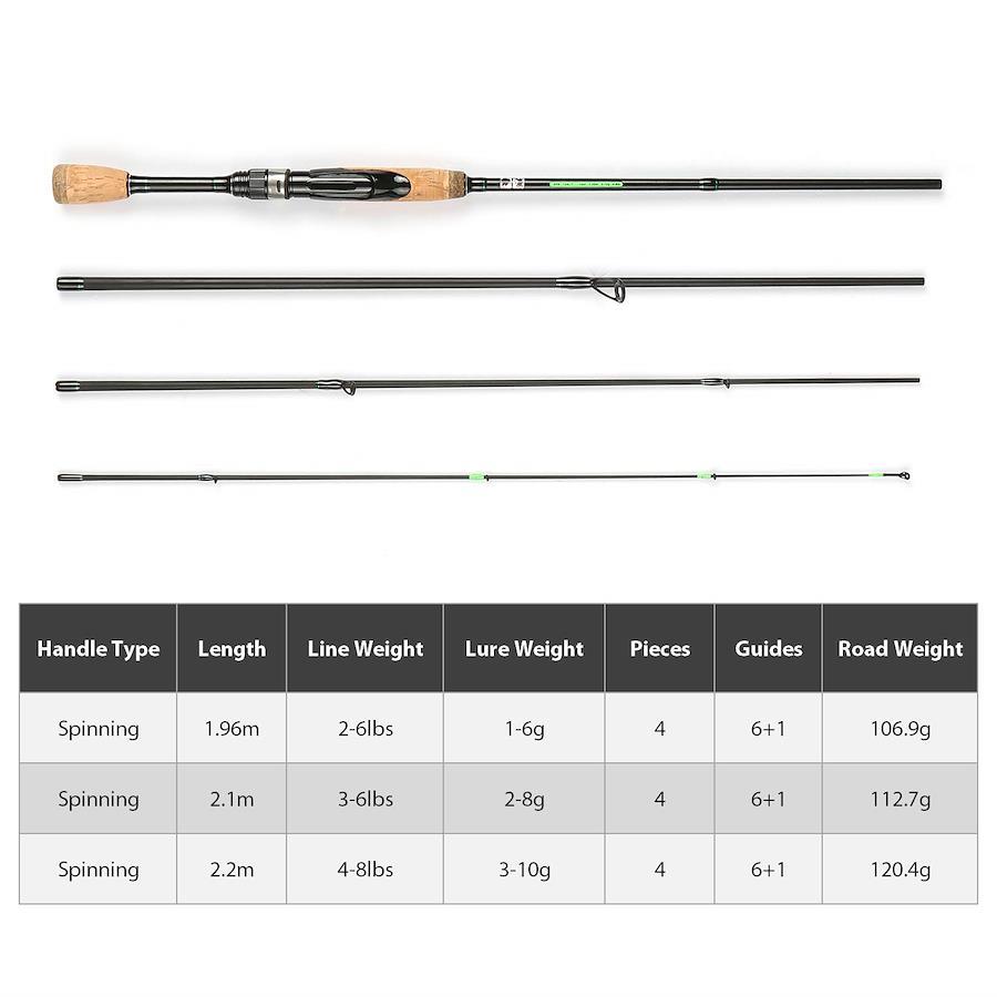 頑丈で軽量のカーボンファイバー構造により、感度とパワーが提供されます。。滑らかなセラミックガイドリング、釣りワイヤーの良好な保護。。滑り止めと吸湿発散性のコルクグリップは、快適さと優れたグリップを提供します。。組み立てが簡単な4つのセクションのデザインと、スピゴットフェルールを備えた安定したジョイント。。ポータブルな構造と付属の収納バッグは、車、トランク、ボート、バックパックなどに簡単に収まります。。