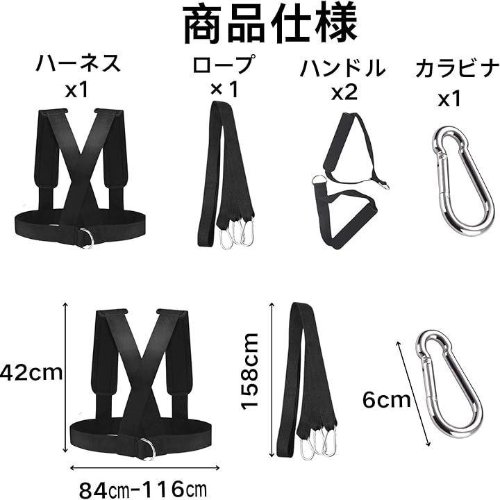 「セット内容」ハーネスx1、ロープx1、ハンドルx2、6号カラビナx1「サイズ」ハーネス:ウエスト調整84cm-116cm、ロープ:約158cm、カラビナ:約6cm
