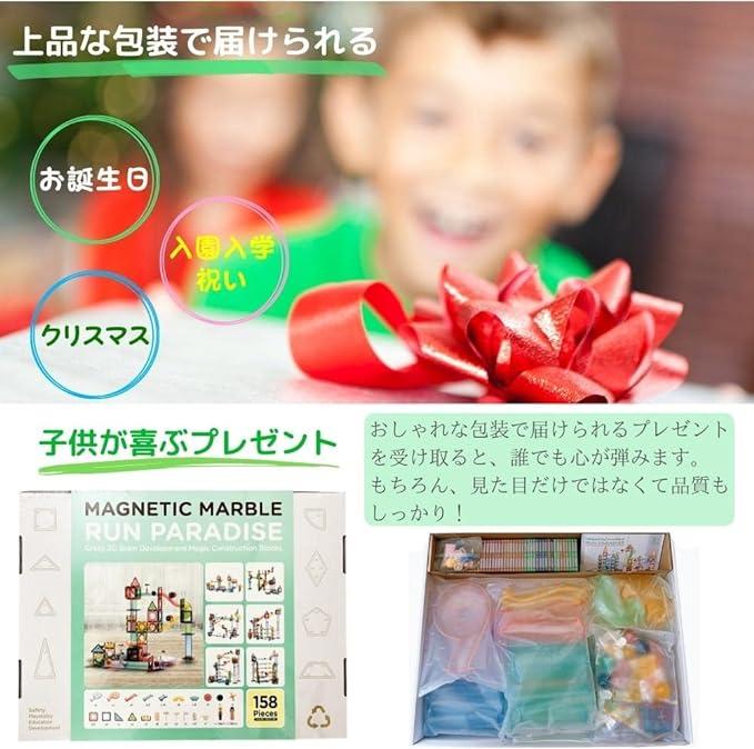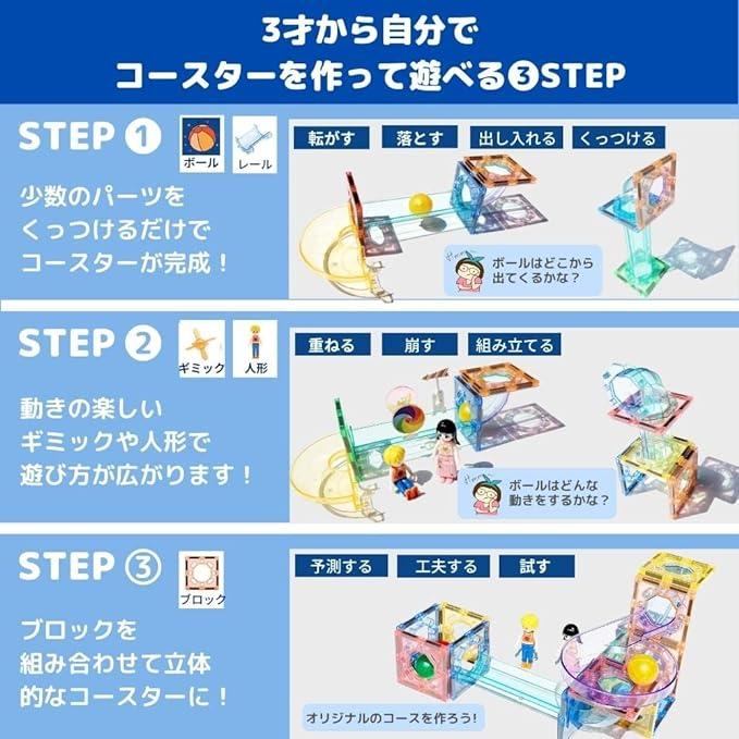 ■商品説明【さらに使いやすく!デザインリニューアル・新色登場】 磁石ブロック:5種 39pcs /スロープパーツ:8種 60pcs /ギミックパーツ:36pcs /人形パーツ:2セット 18pcs /ボール(直径30mm):5pcs 【キラキラと輝いている立体遊び知育玩具、ボール転がしおもちゃで知育】「考える」「組み立てる」「試す」「直す」の4つのステップで、子どもたちは粘り強く取り組む力と集中力を身につけます。それは同時に達成する喜びとなり、お子さまの自信へとつながります♪ ボールがクルクル回って流れ落ちる様子から、もう目が離せません! 【インテリアにも馴染む、おしゃれなおもちゃ!】マグネットブロックのパーツは、特殊加工により半透明となっており、程よい厚みがあり非常に丈夫です。韓国産高品質なMABS樹脂(メーカー:LG化学)を使用しているため、軽量でありながら衝撃や汚れに強く、長くお使いいただけます。色彩も鮮やかで、光が当たると、またはライトを入れると、美しい輝きを放ち、ステンドグラスやイルミネーションのようにキラキラと輝きます。芸術的な形は子供たちの好奇心を刺激し、飽きずに楽しんでいただけます。 【遊びながら楽しく学べる知育玩具】手先を使ってボールの動きを予測しながら遊ぶため、脳にたくさんの刺激を与えてくれ、図形や立体への感覚を養う上では抜群の知育効果を持つ、子供だけでなくママやパパからも人気を集めています。プレイスペース、児童館、保育園、幼稚園への納入も多数あり、お誕生日、入園・入学祝い、クリスマスなどのプレゼント、ギフト、贈り物に選ばれています♪ 【安心の保証】お客様にご安心してご購入いただく為、商品ご到着後3ヶ月間の交換保証をお付けしております。万が一商品に初期不良、または通常使用による破損、不具合などがあった場合は、必ず迅速に対応致します。お気軽にご購入履歴のお問い合わせよりか弊社にメールしていただければと思います。警告: この商品には小さな磁石が含まれています。磁石を飲み込んでしまった場合、腸全体に粘着し、重度の感染症や死亡を引き起こします。磁石を飲み込んだり、吸い込んだりした場合は、すぐに医師の診察を受けてください。?もっと見る