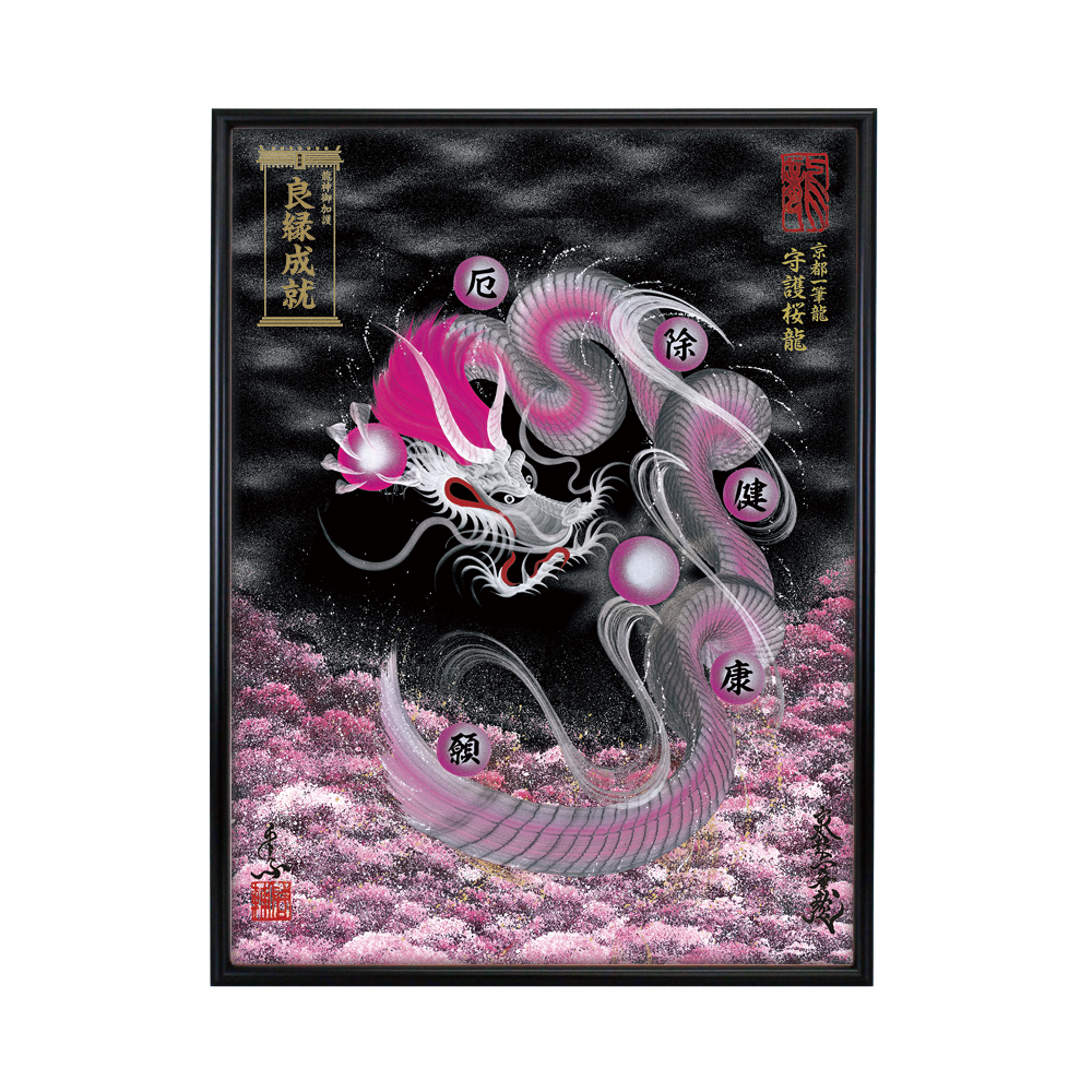 【商品の特徴】・京都一筆龍描画の種類/色彩は【26種】よりお選びいただけます<昇運龍14種(双龍5種/1体龍9種)> <守護龍10種(双龍2種/1体龍8種)> <縁結び龍2種(双龍2種)>・『京都一筆龍の御加護/御利益の象徴=胴体部分を一切途切れさせず一筆で描く動画』のQRコード印字ステッカー(2色/4サイズ)を同封お納めいたしております・描画に記載可能なお願い事は6種のご祈願内容より御選定いただけます心願成就/事業繁栄/金運上昇/健康祈願/家内安全/良縁成就・国内生産の高級額縁(デッサン額)を使用。額縁の色/機能は7種よりお選びいただけます。・龍の眼に光を宿し生気を吹き込む『龍の瞳(ラインストーン)』加工・京都一筆龍絵師手島啓輔署名、落款入り・御贈答のご利用も多く、懇切丁寧な包装