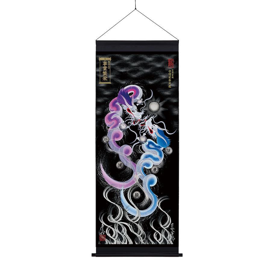【商品の特徴】・京都一筆龍描画の種類/色彩は【26種】よりお選びいただけます<昇運龍14種(双龍5種/1体龍9種)> <守護龍10種(双龍2種/1体龍8種)> <縁結び龍2種(双龍2種)>・『京都一筆龍の御加護/御利益の象徴=胴体部分を一切途切れさせず一筆で描く動画』のQRコード印字ステッカー(2色/4サイズ)を同封お納めいたしております・描画に記載可能なお願い事は6種のご祈願内容より御選定いただけます心願成就/事業繁栄/金運上昇/健康祈願/家内安全/良縁成就・御札など添付のお祀り用マグネットを使用してお祀り(取り外し/位置変更可能)・発色が良く落ち着いた風合いの防炎スエード生地製(厚み約0.35~ ※官製郵便はがき約1.5枚程度/コピー用紙約4枚分程度)※ スエードは皮革・合成皮革ではなく専用布の名称となります。・吊り下げ用の上下軸棒付き(下部は軸先付き)※軸棒を外して飾られる場合でも、紐や止め具(画鋲、釘、ネジ等)をお使いいただけるハトメ穴付き(表面からは見えません)・丈夫で切れにくくシンプルな風合いの江戸打ち紐付き(黒/白2色)・龍の眼に光を宿し生気を吹き込む『龍の瞳(ラインストーン)』加工・京都一筆龍絵師手島啓輔署名、落款入り・御贈答のご利用も多く、懇切丁寧な包装